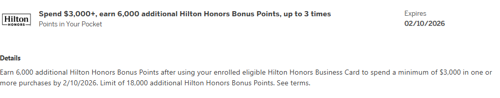 - Targeted Amex Hilton Offer: Spend $3000 in one or more purchases and get 6,000 bonus points (there is also a $10,000/20,000 version, and probably others)