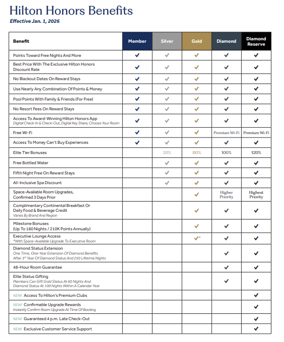 Hilton elite benefit comparison chart for 2026