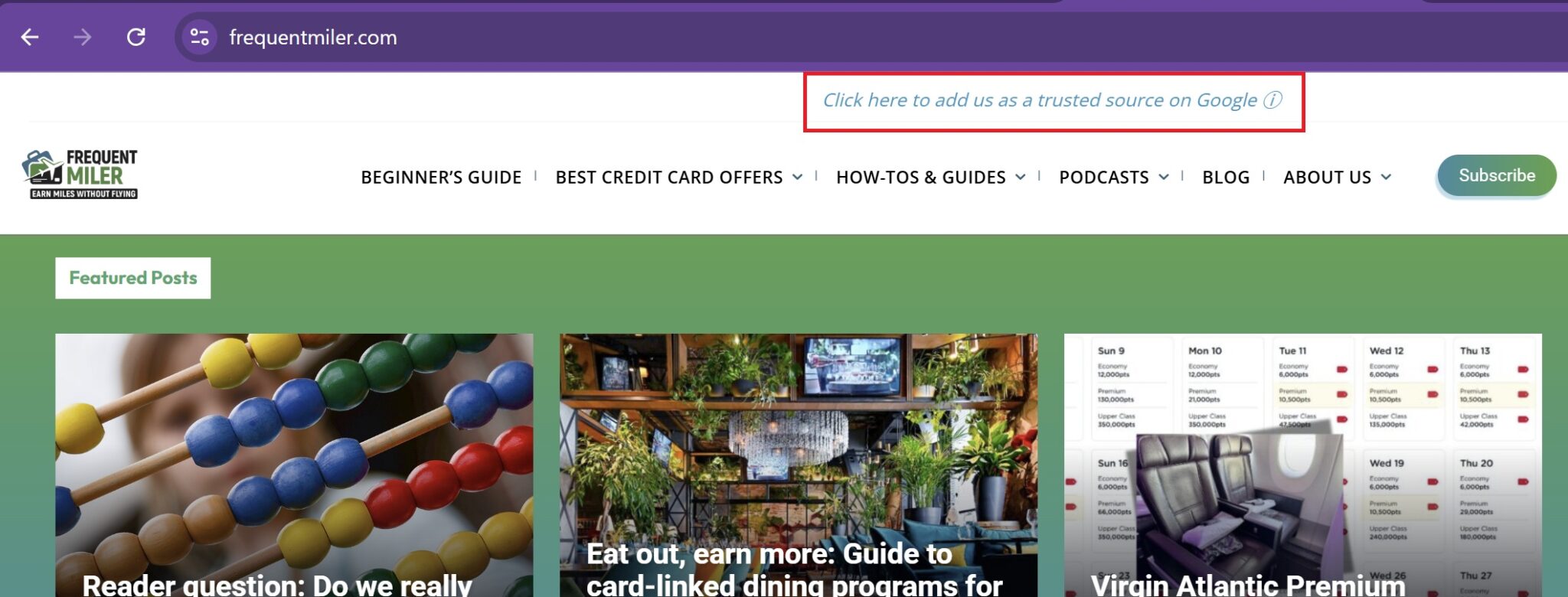 Obviously, if you subscribe to our newsletter and read our content regularly, this may not be a necessary step for you. However, if you find yourself wishing you could prioritize Frequent Miler responses to your miles and points searches, this could be a way to tell Google which sites you would like to prioritize (Frequent Miler and/or others you enjoy).
