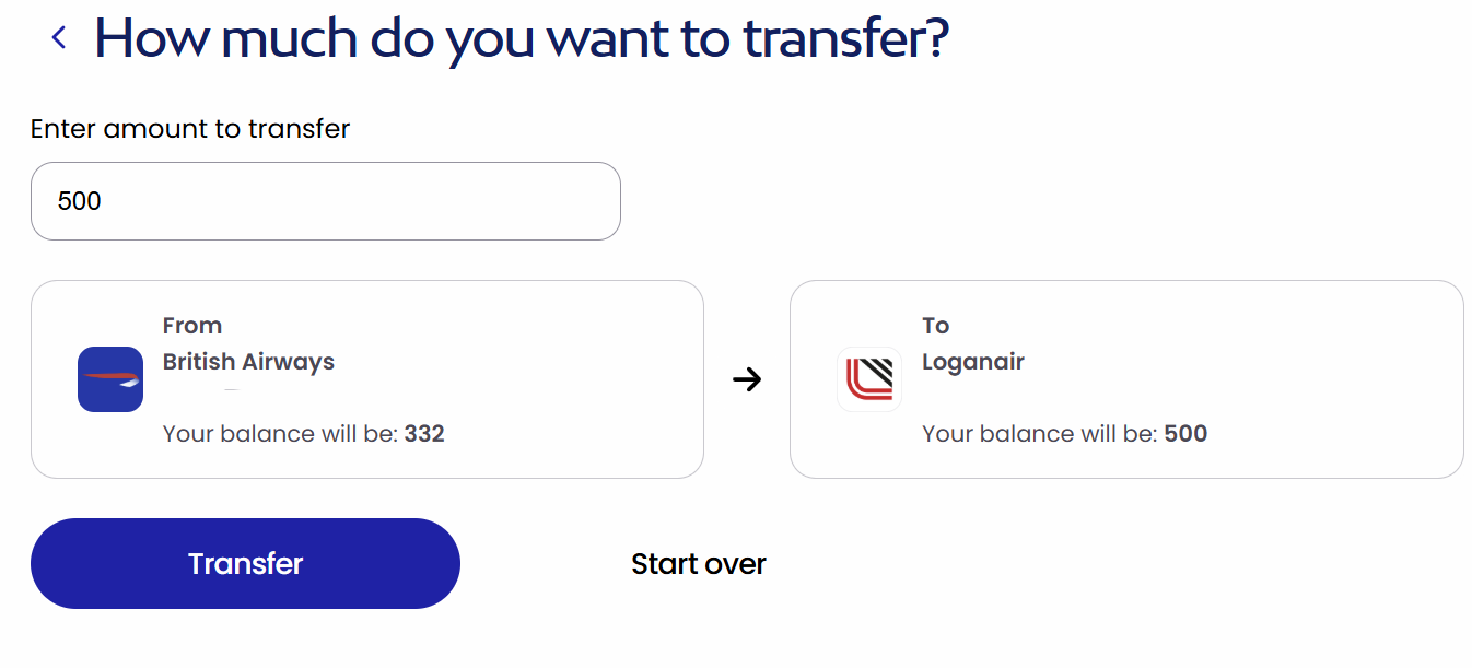 In the example above, I chose to transfer from BA, which is why it isn’t an option to transfer to. Choosing Logainair and click the “next” button takes to me to the following screen: