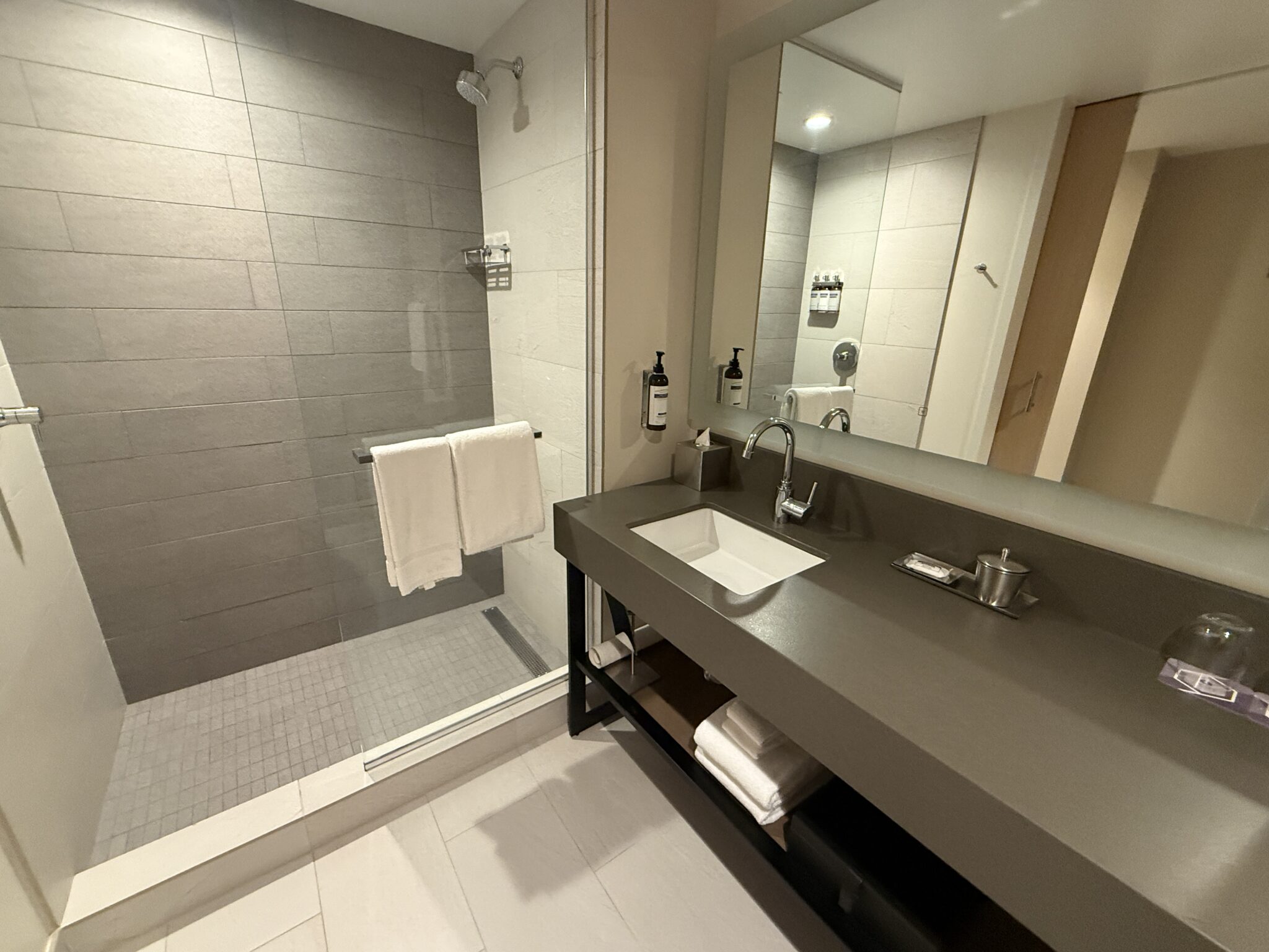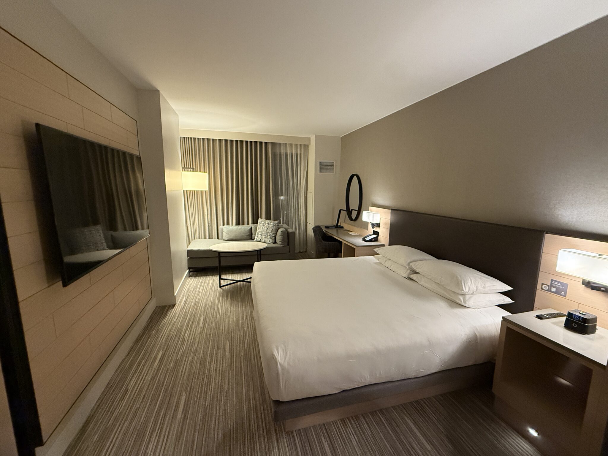 - Room: I was upgraded to a 320 sq ft King Room on a high floor. The hotel is relatively new, so the various furnishings, while no one’s idea of high-quality, are in pretty good shape. A significant downside for us was the bed, which was one of the most uncomfortable I’ve ever had in a Hyatt; both my wife and I were sore from it the next morning. It felt like something you might find at a discount mattress store, which was surprising given how new this property is.