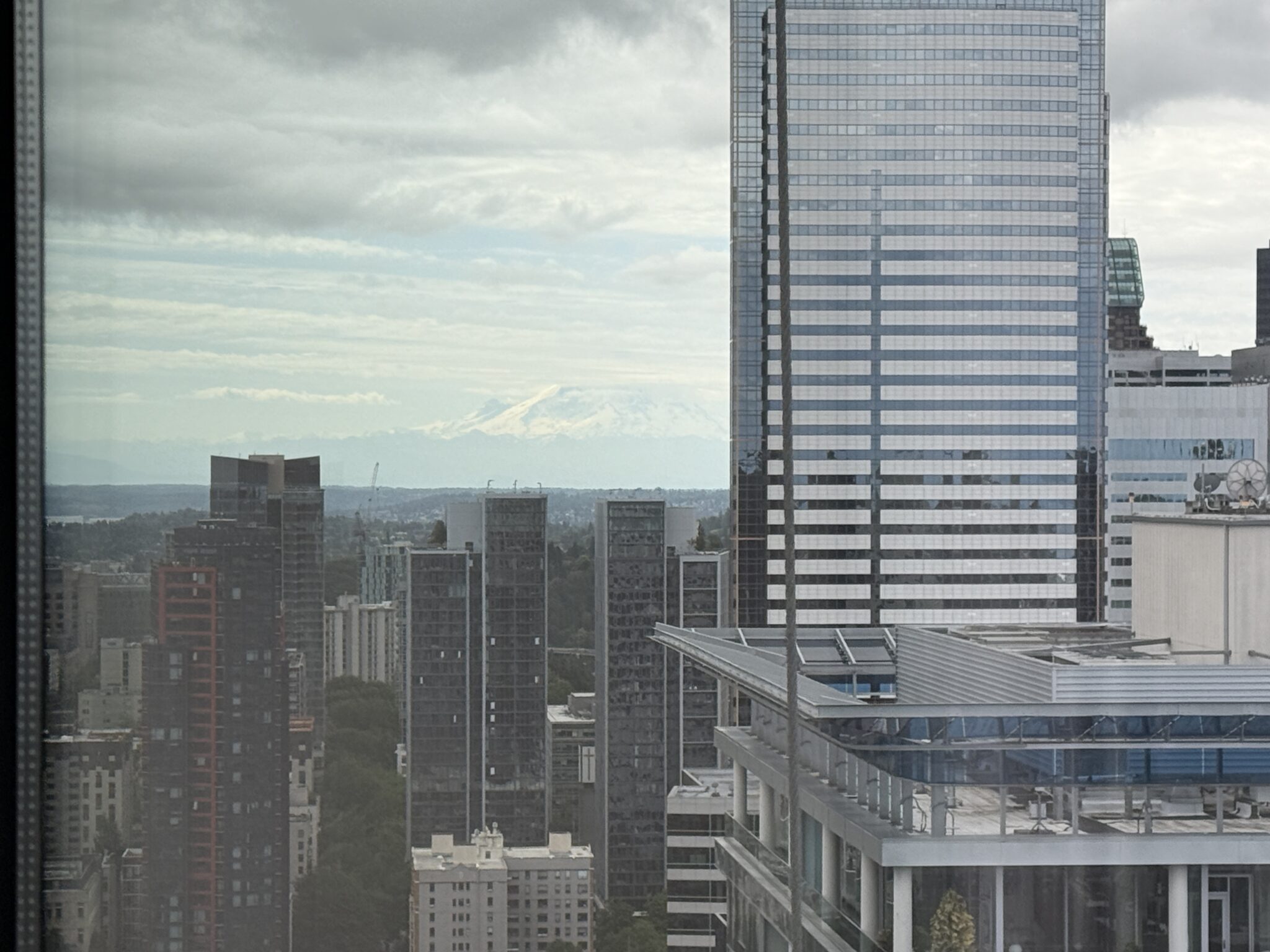 - Room Upgrade: I booked a standard room and was upgraded to a high-floor room with a view of the city and Mt Rainier. The room was a fairly standard Hyatt Regency King, but with an exceptionally uncomfortable bed.