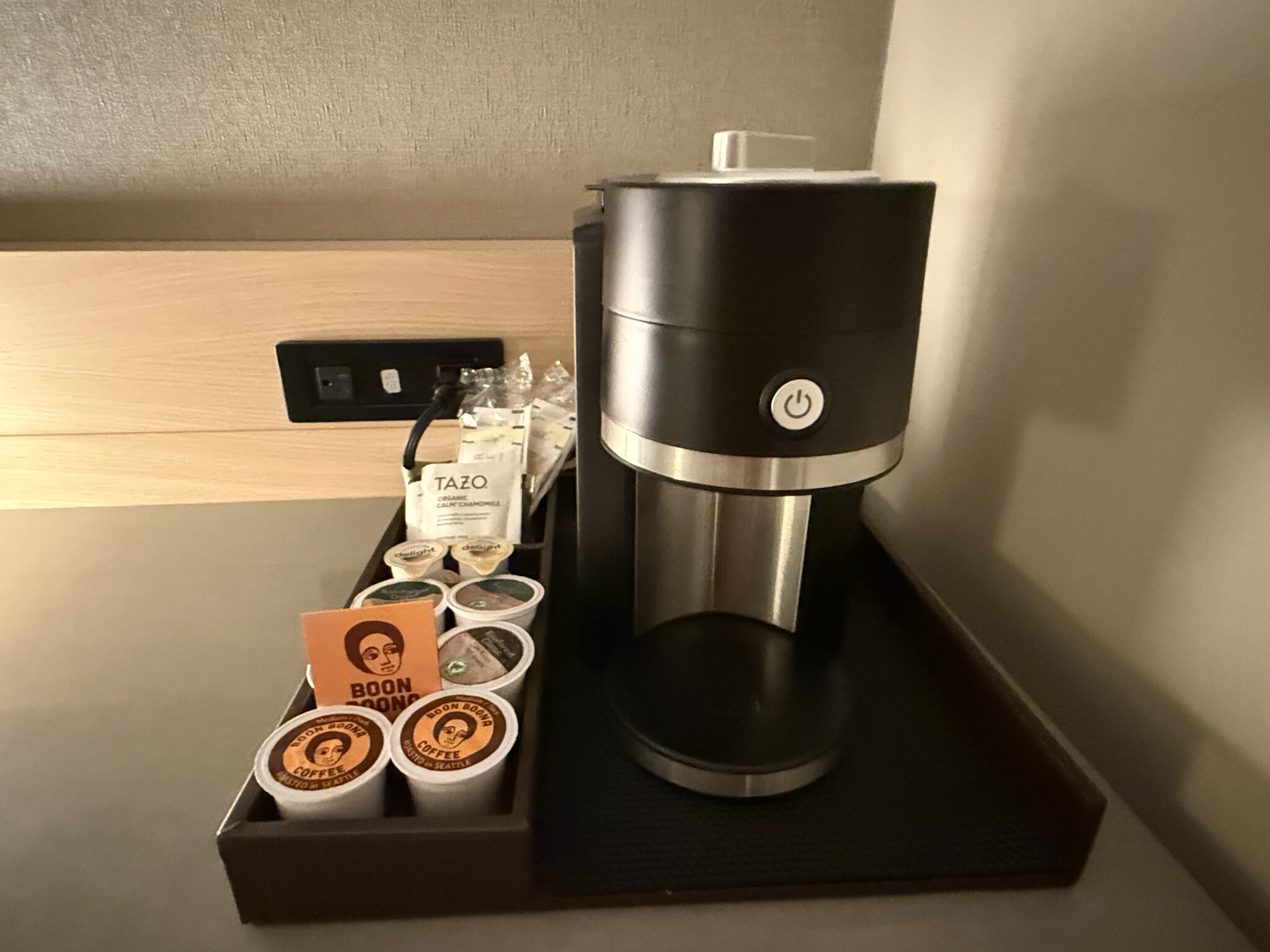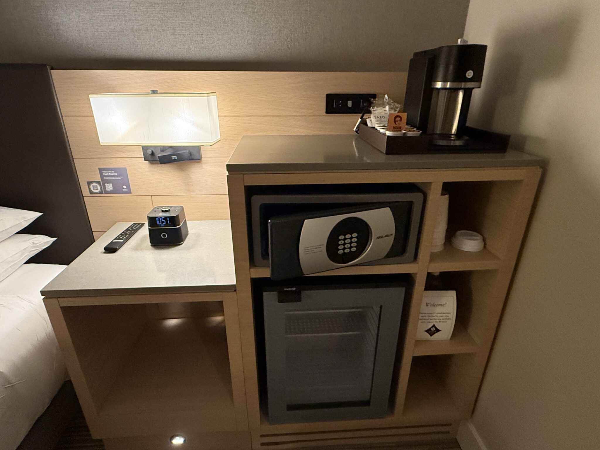 - Room: I was upgraded to a 320 sq ft King Room on a high floor. The hotel is relatively new, so the various furnishings, while no one’s idea of high-quality, are in pretty good shape. A significant downside for us was the bed, which was one of the most uncomfortable I’ve ever had in a Hyatt; both my wife and I were sore from it the next morning. It felt like something you might find at a discount mattress store, which was surprising given how new this property is.