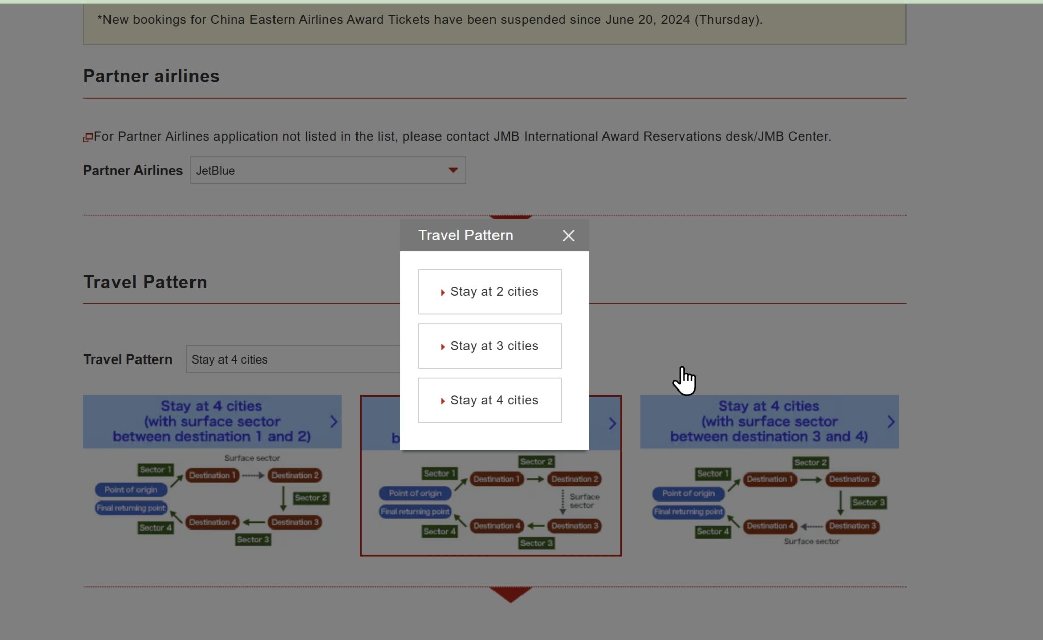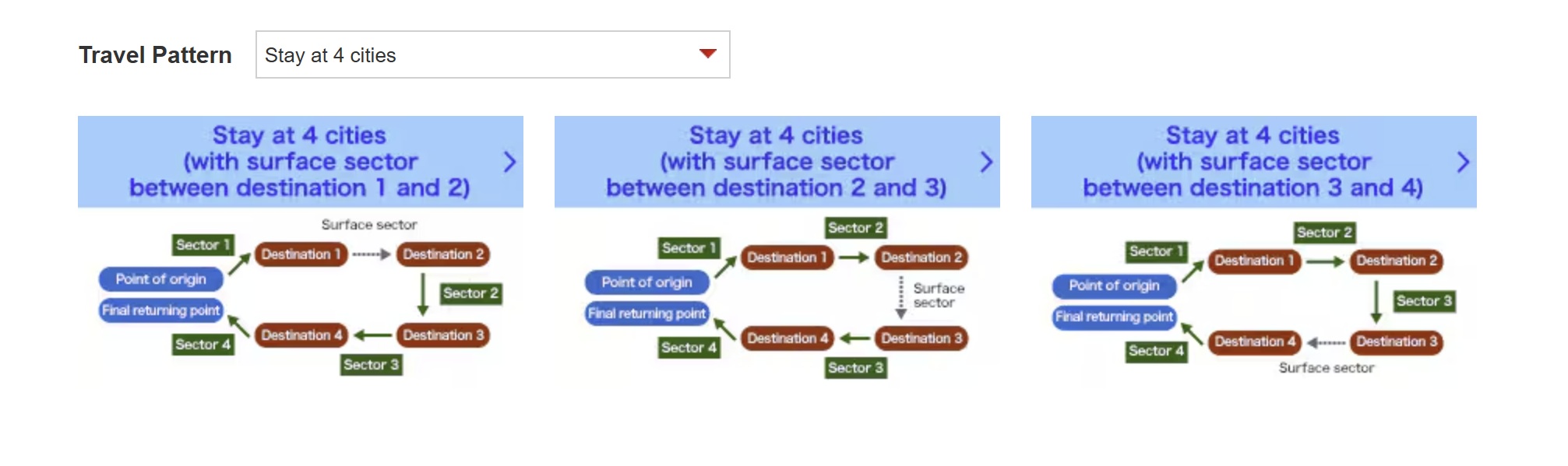 Behind the pop-up in the screenshot above, you’ll see multiple different outlines for a stay in multiple cities. This multi-city search tool assumes that you will have a surface sector, also known as an open-jaw (where you arrive at one airport, then depart from a different airport). With this search tool, you need to choose a travel pattern that includes a “surface sector” (in other words, you must have a sector that you connect by driving or with a separate flight). You’ll click on one of the three pictures and it will adjust the search tool to account for where in the interary the surface sector should appear.
