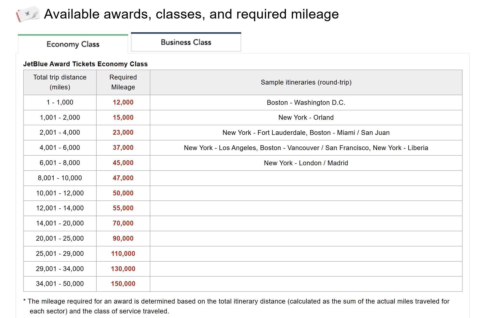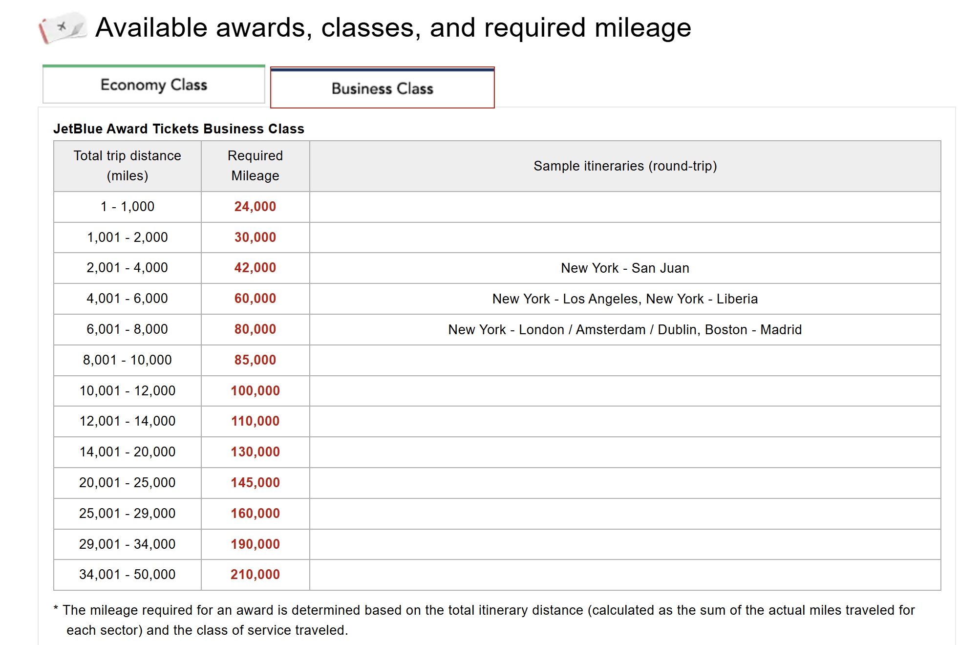 Japan Airlines Mileage Bank offers a distance-based award chart for JetBlue flights. Here is the chart for economy class: