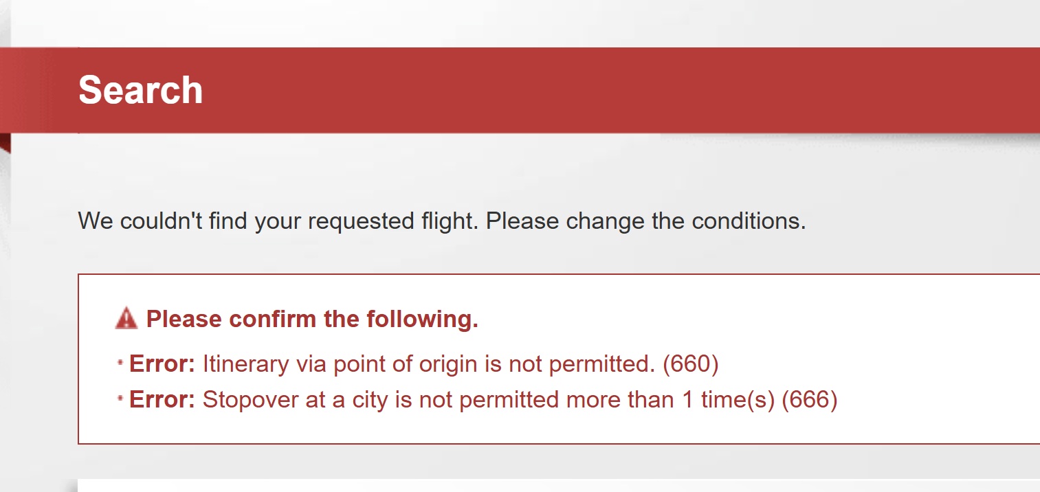 I spent hours playing with the search tool to put together the above itineraries, and in the process, I ran into a number of roadblocks in terms of routing rules that I couldn’t quite understand. I ran into errors suggesting that I couldn’t re-transit the point of origin or stop over in the same city twice: