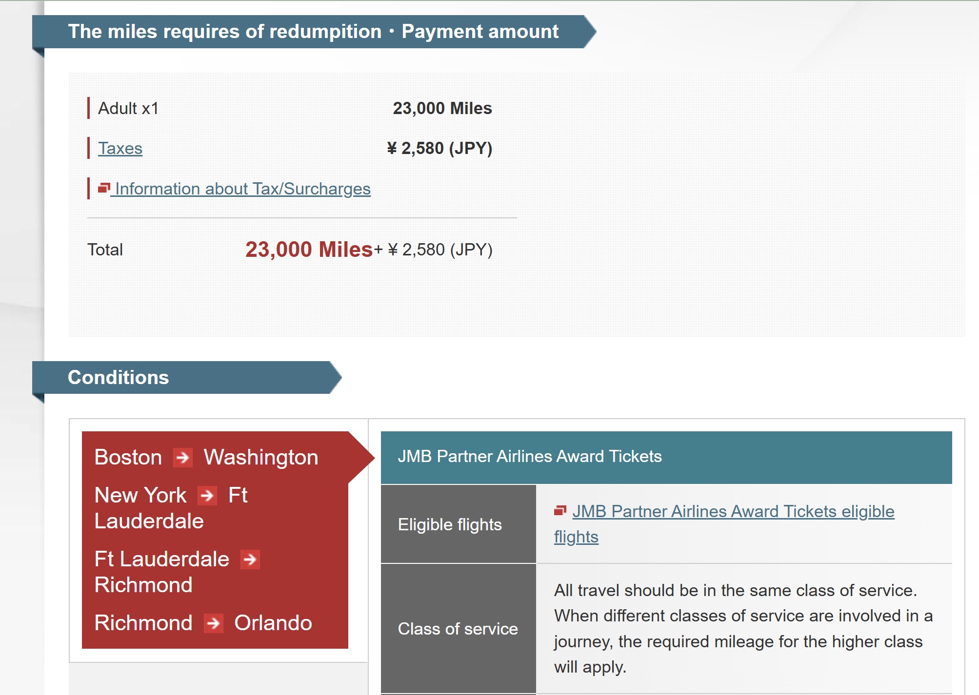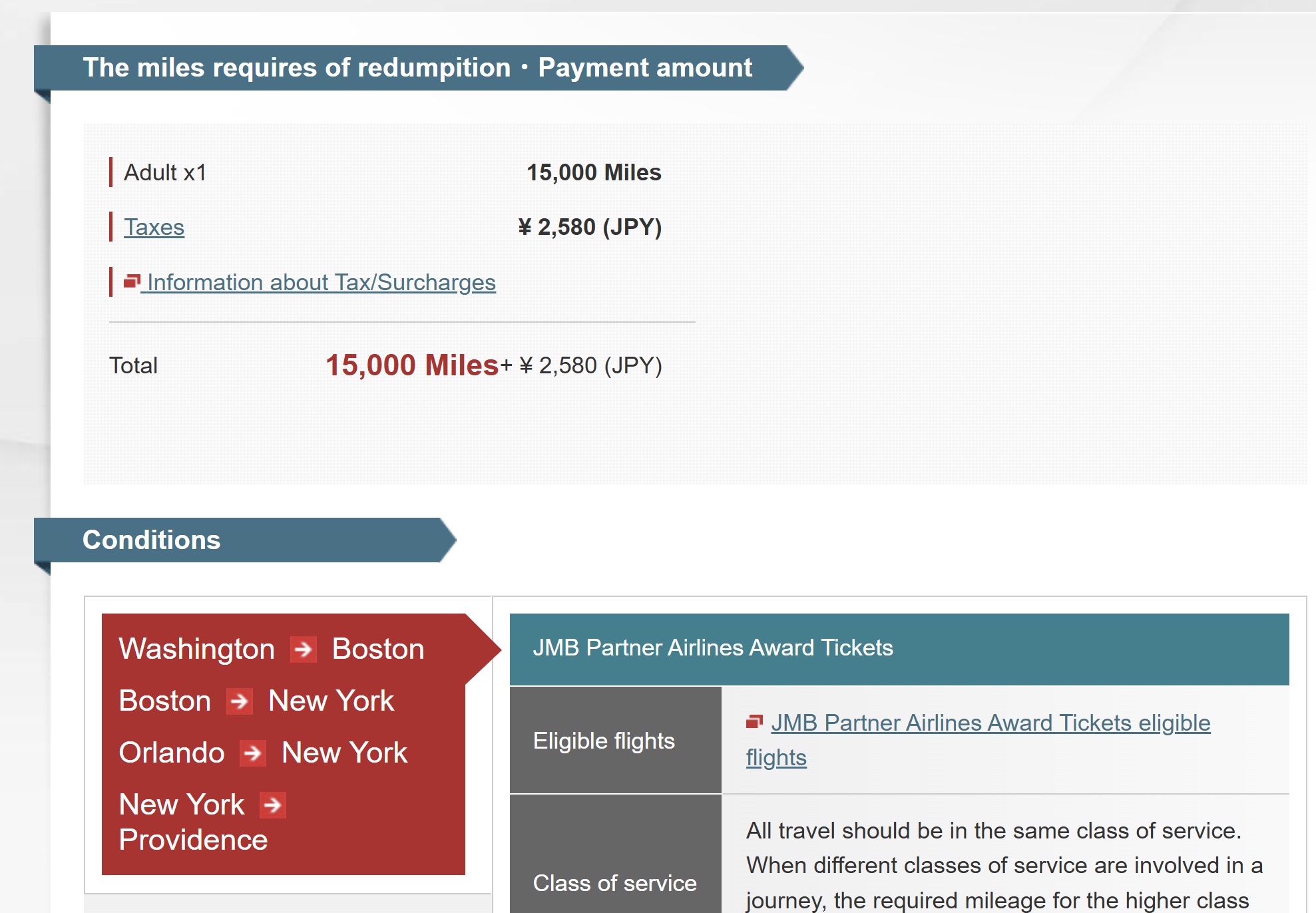 That second itinerary is actually a bit fewer than 2,000 miles flown, so it costs only 15,000 Japan Airlines miles.