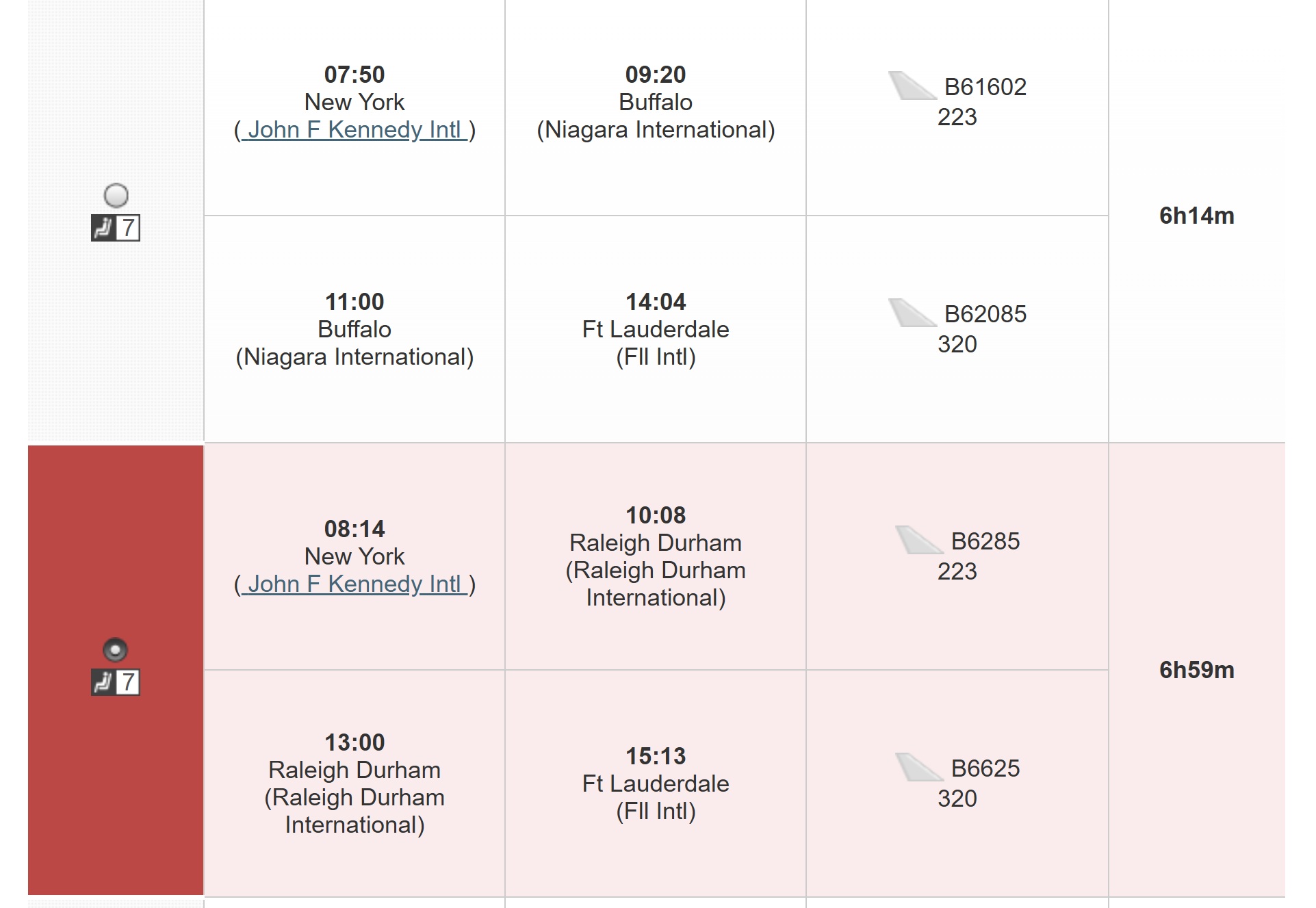 But, the good news is that when the tool showed availability, it was often for 7 seats, such as both of these itineraries from New York to Fort Lauderdale (one connecting in Boston and the other in Raleigh-Durham).