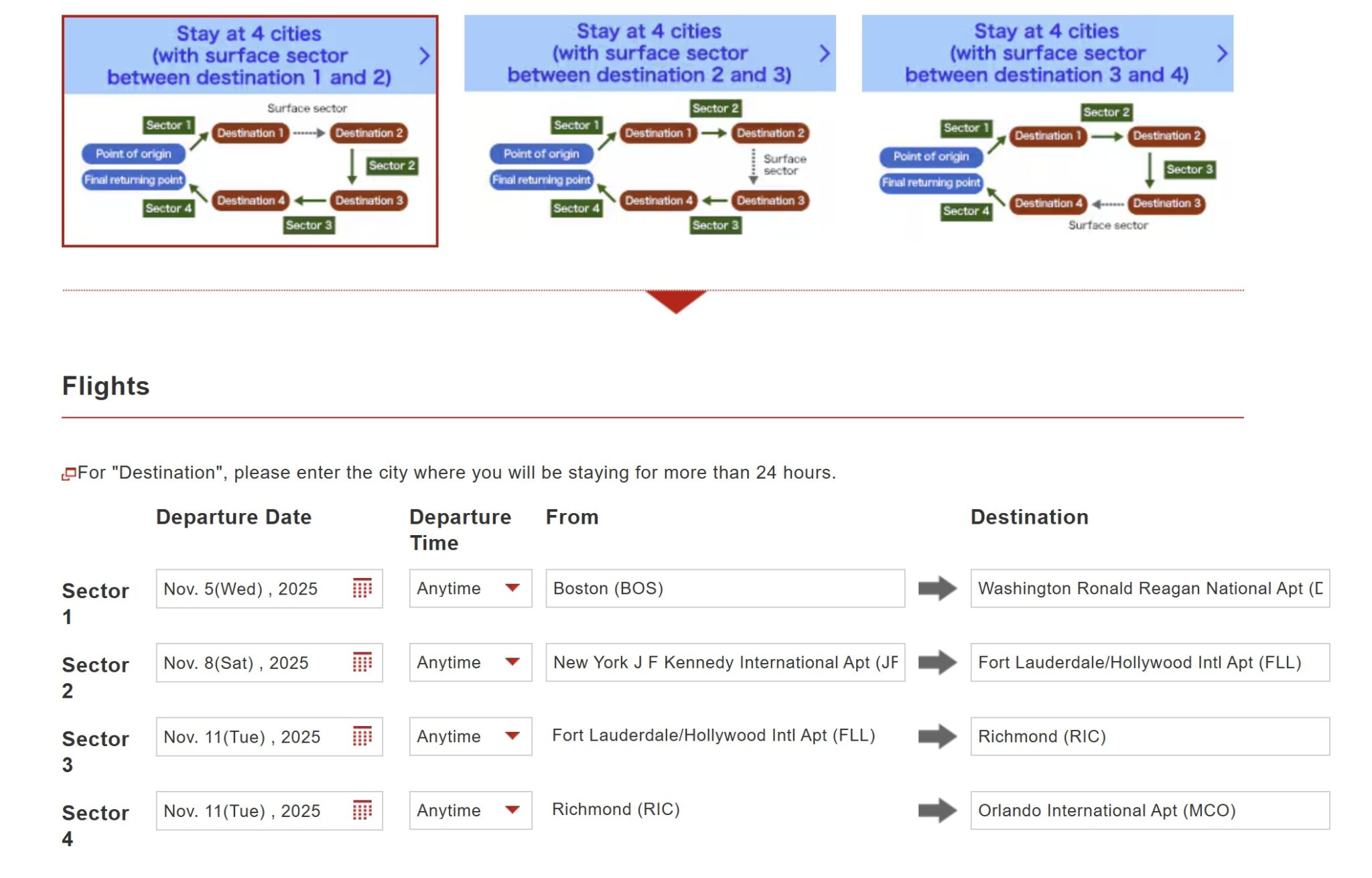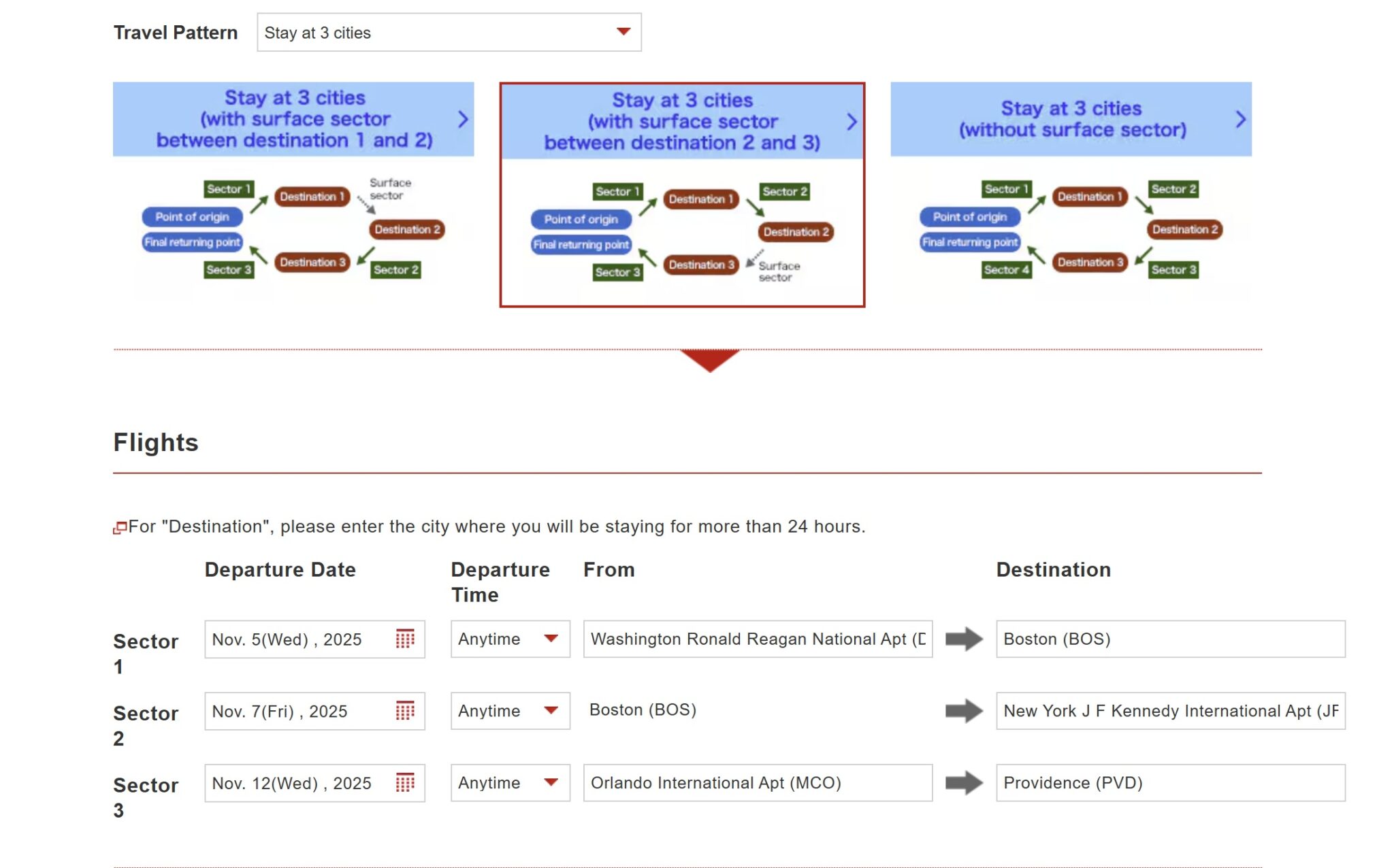 As an example, here is a search with the first travel pattern, where the surface sector is between the first and second sectors.