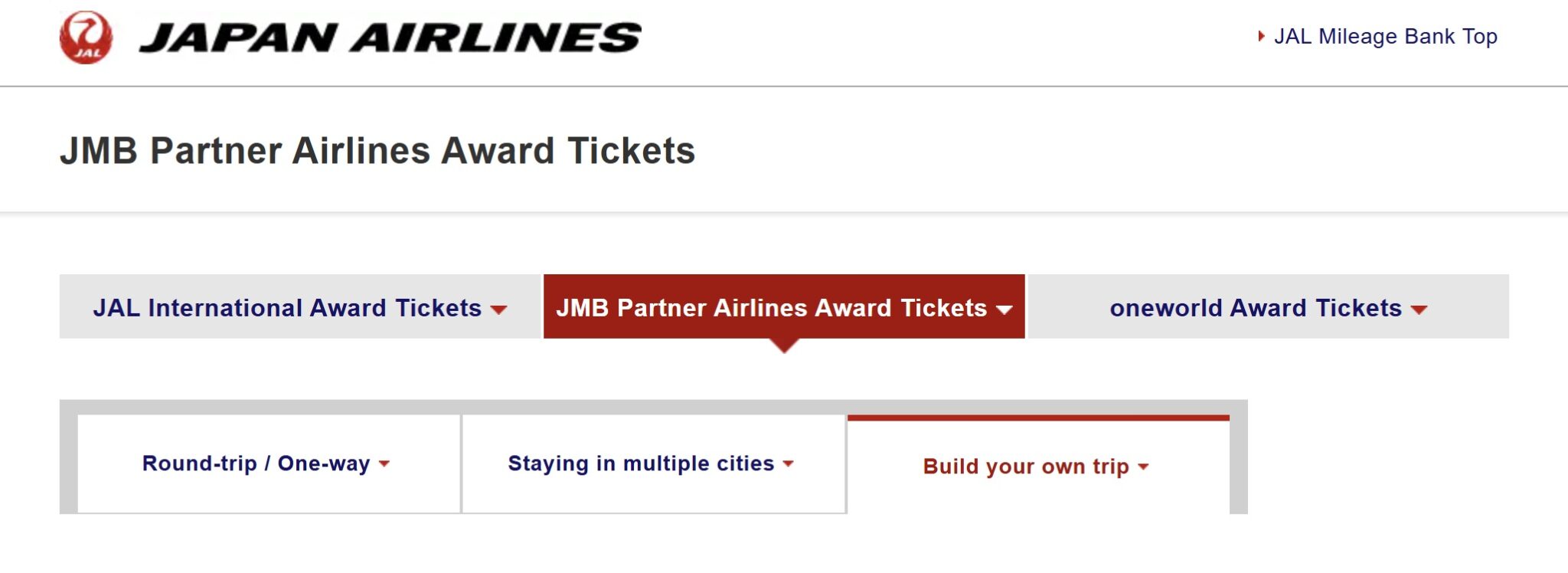 There are a multitude of award search options on the Japan Airlines website, but to find awards on JetBlue, you’ll need to start with JMB Partner Airlines Award Tickets and then choose round-trip/one-way, staying in multiple cities, or build your own trip (and choose JetBlue as the airline to search).