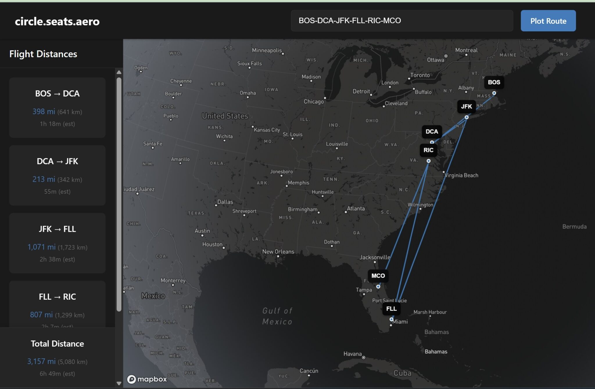 The total distance flown on that itinerary would be a bit over 3,000 miles.