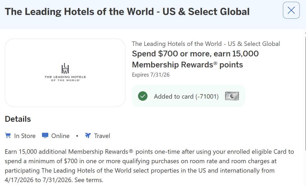 - Earn 15,000 additional Membership Rewards® points one-time after using your enrolled eligible Card to spend a minimum of $700 in one or more qualifying purchases on room rate and room charges at participating The Leading Hotels of the World select properties in the US and internationally from 4/17/2026 to 7/31/2026.