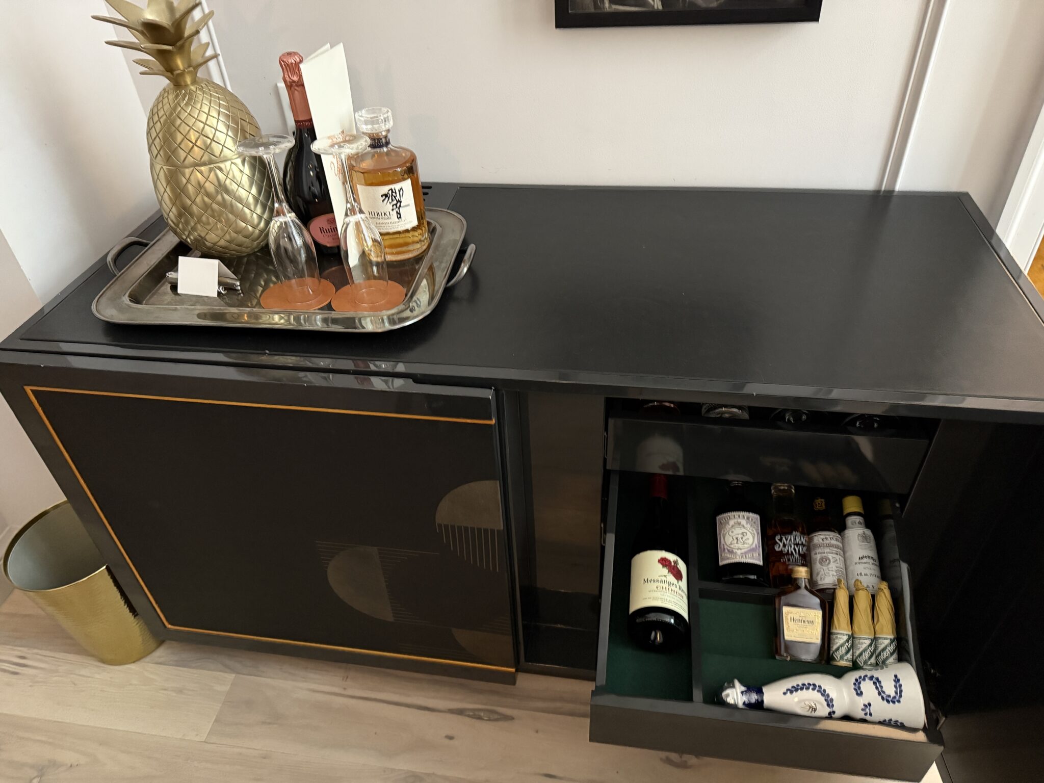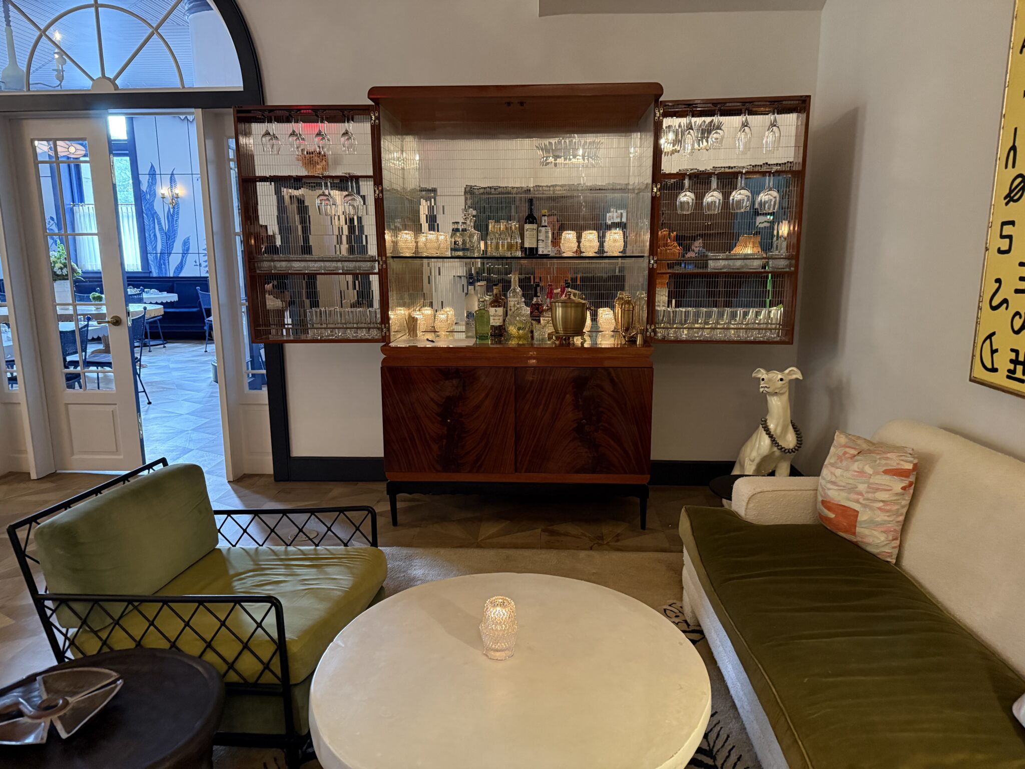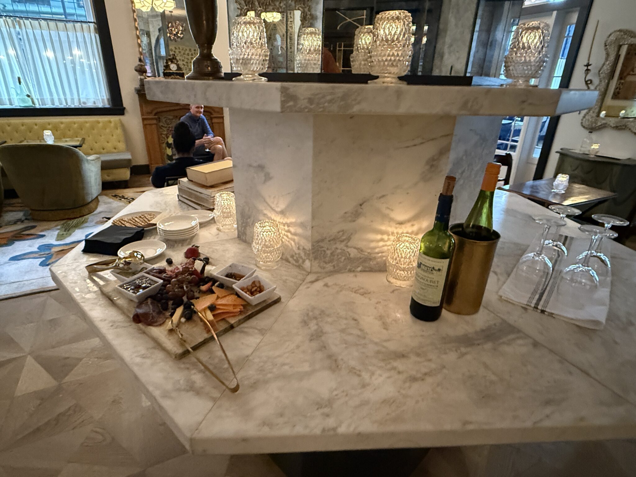 • Living Room: Lovely space with several seating areas oriented around a counter-lined column. This serves as the primary public space, changing functions throughout the day. In the morning, there’s coffee and tea (and this is where they lay out the breakfast buffet), in the afternoon, it changes to iced tea, lemonade, and small snacks. From 6 pm to 8 pm, complimentary wine and charcuterie are served, alongside an honor bar in the evening that stays open late and is stocked with complimentary cookies.