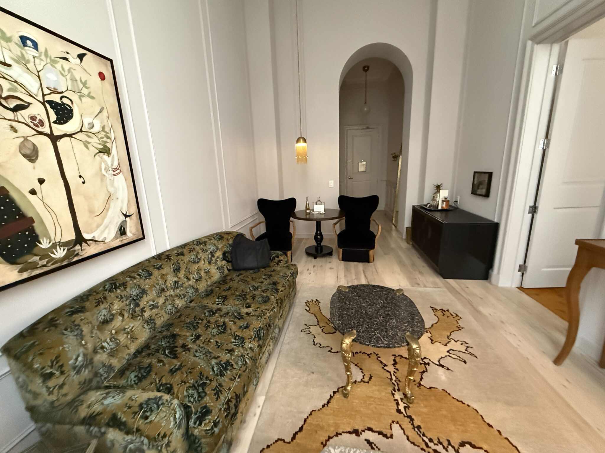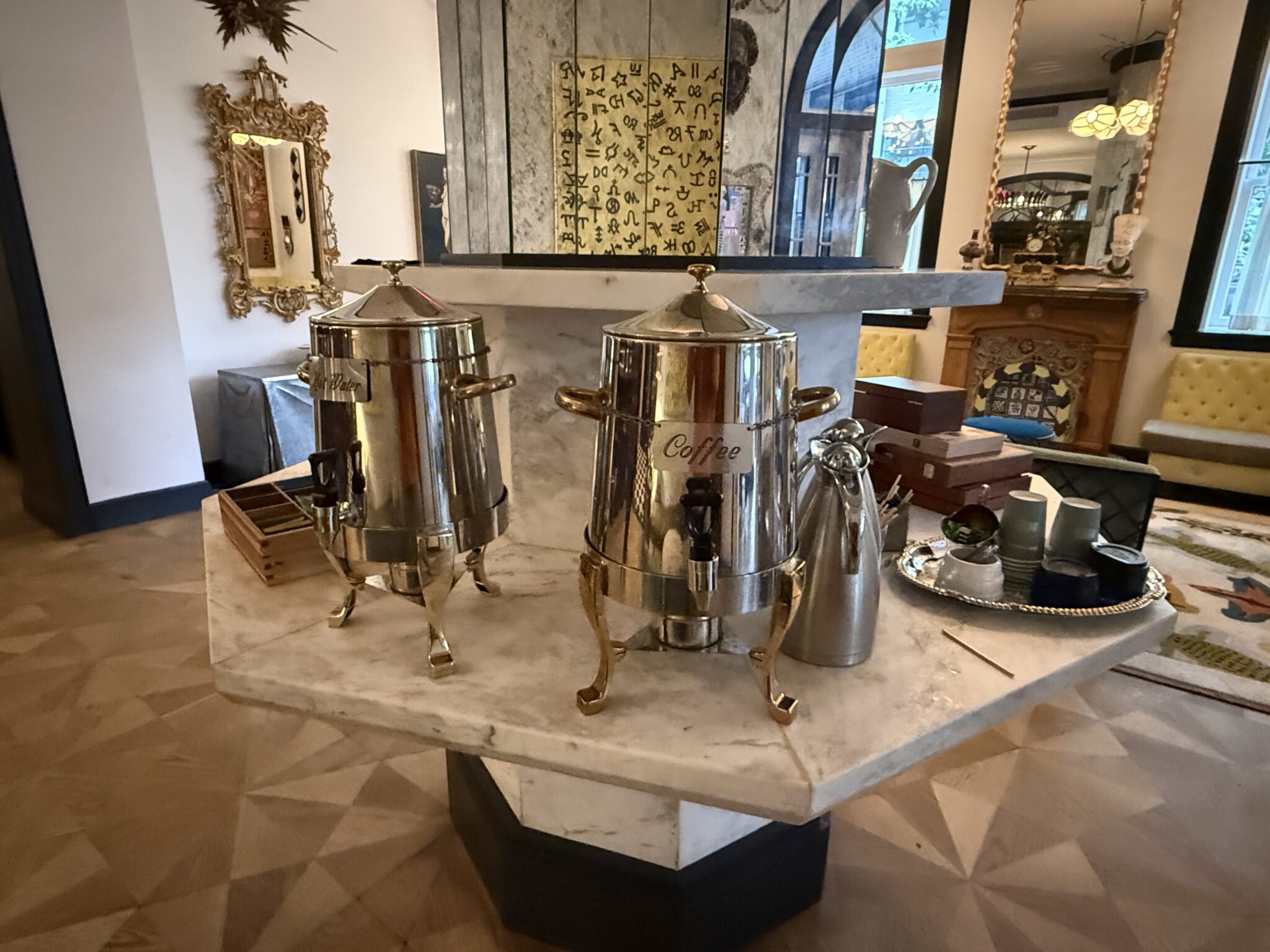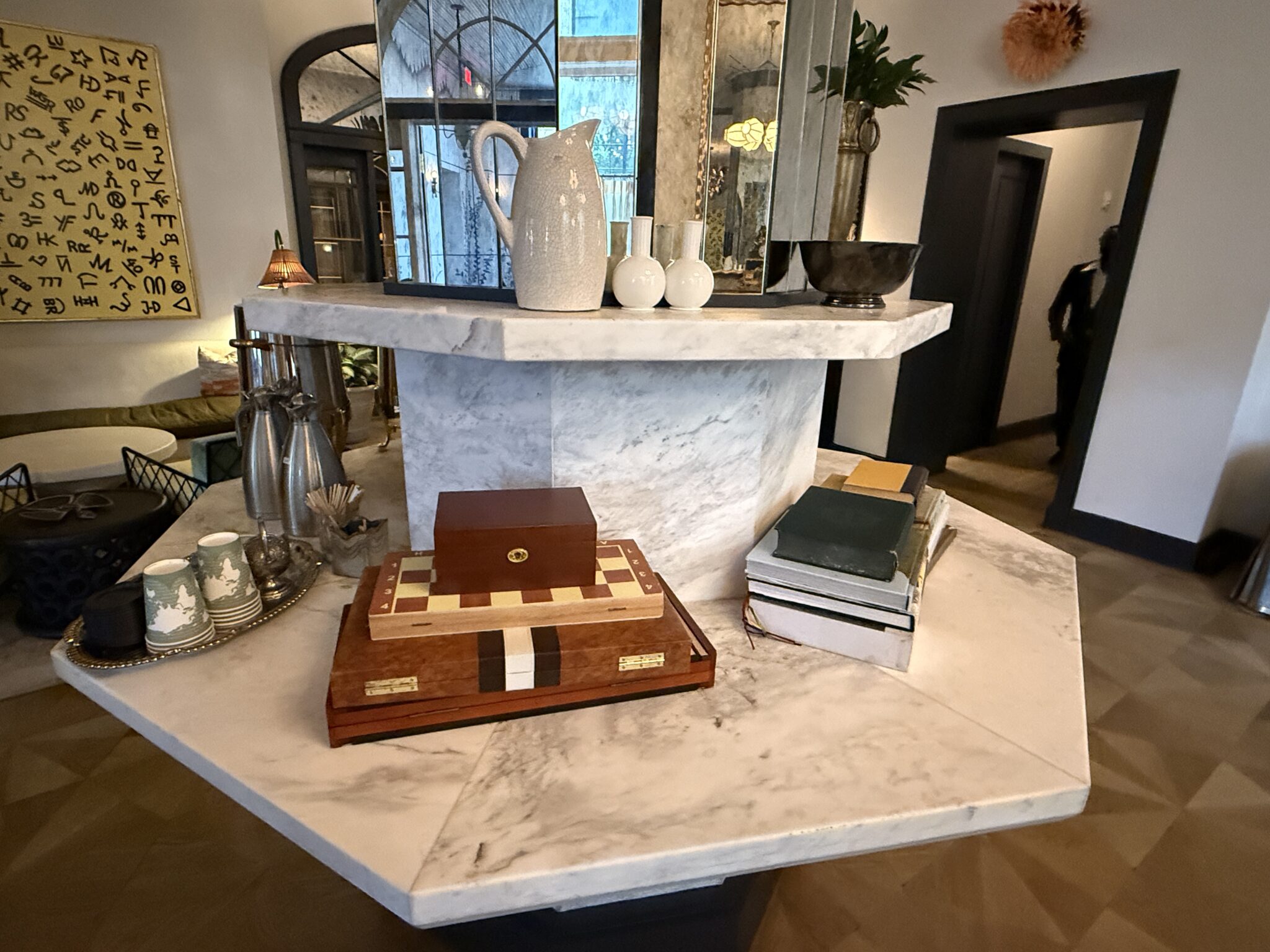 • Living Room: Lovely space with several seating areas oriented around a counter-lined column. This serves as the primary public space, changing functions throughout the day. In the morning, there’s coffee and tea (and this is where they lay out the breakfast buffet), in the afternoon, it changes to iced tea, lemonade, and small snacks. From 6 pm to 8 pm, complimentary wine and charcuterie are served, alongside an honor bar in the evening that stays open late and is stocked with complimentary cookies.