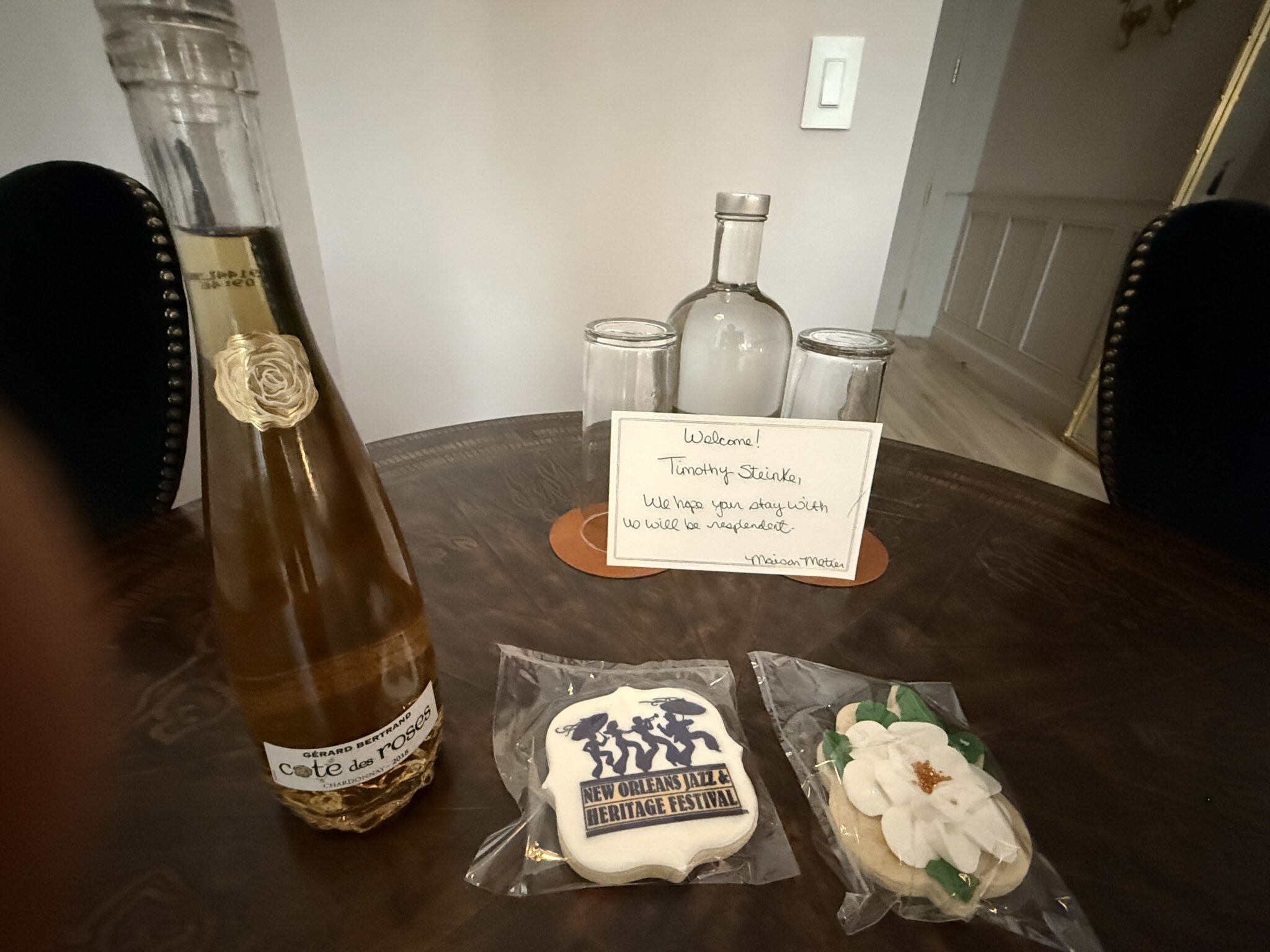 • Welcome Amenity: Two New Orleans-themed sugar cookies and an old bottle of oxidized (and undrinkable) Chardonnay that we initially mistook for rosé.