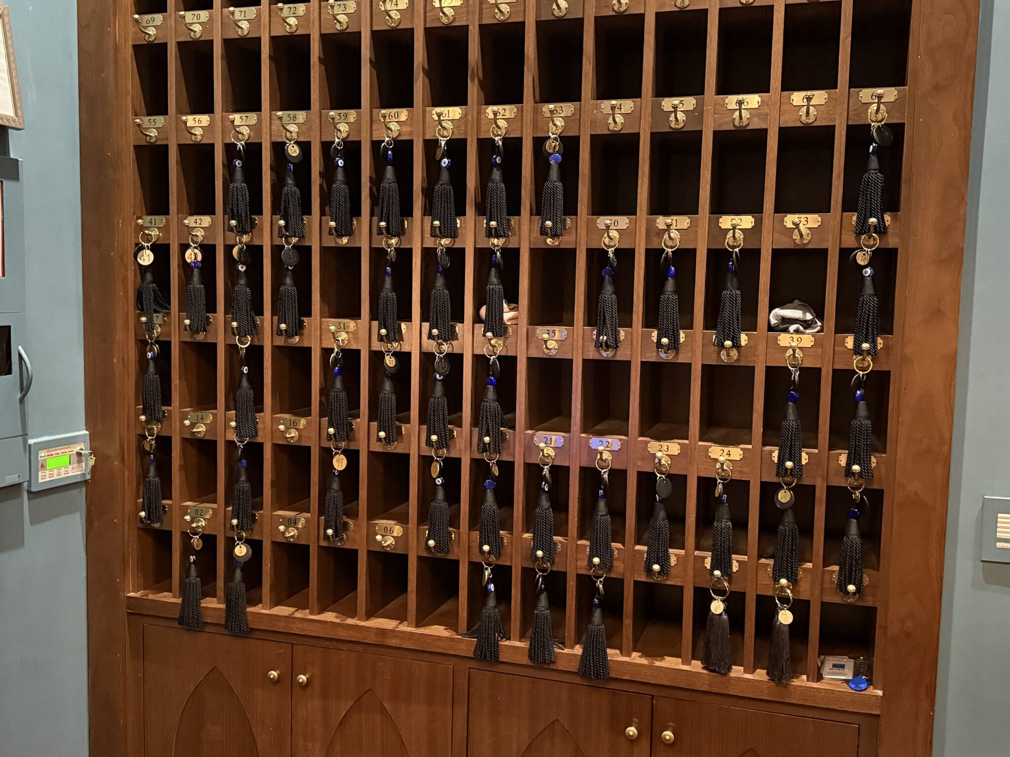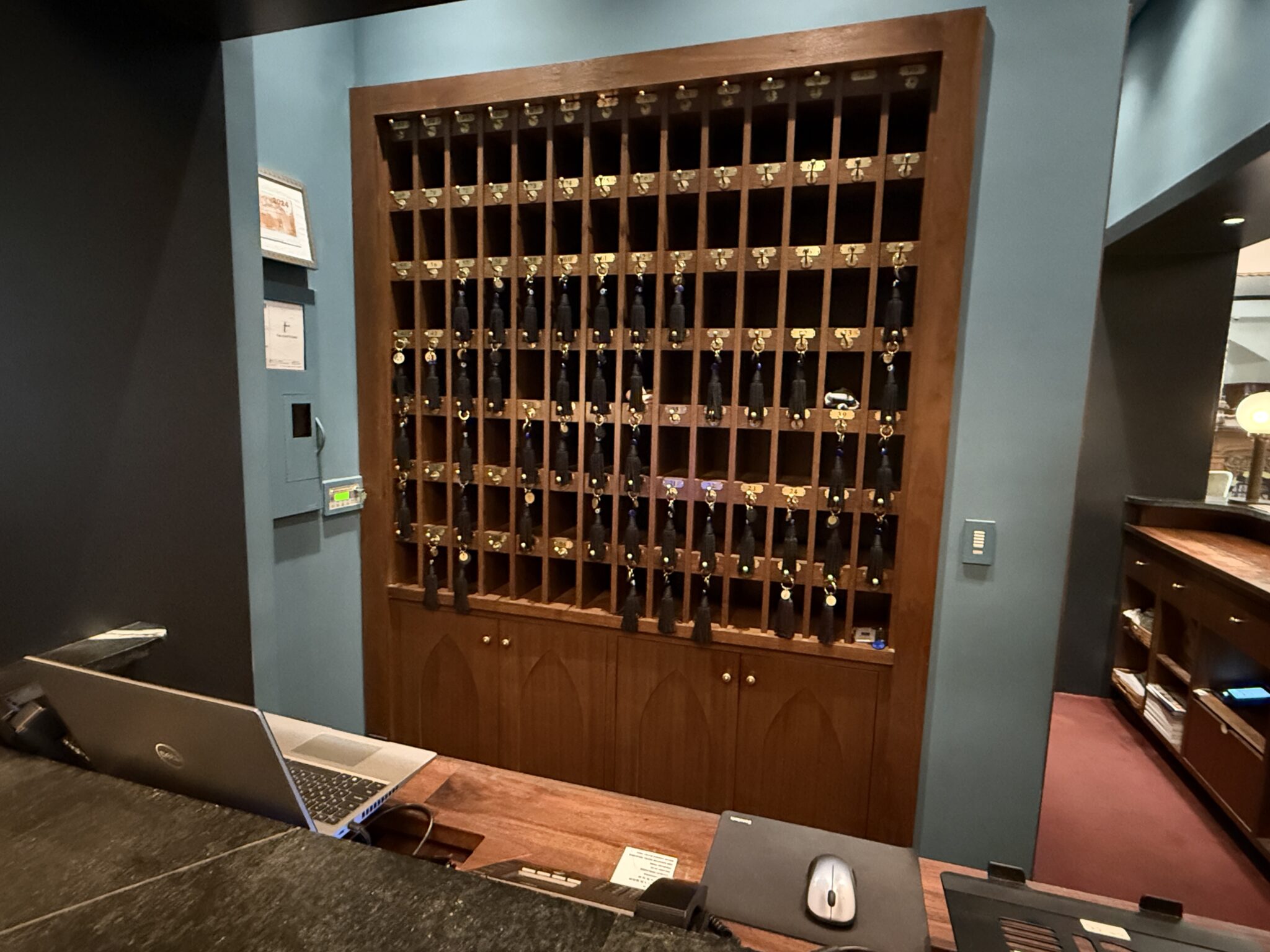 Keys are kept behind the desk. In addition, the tassel serves to let housekeeping know that you’re reading for room service…in theory.