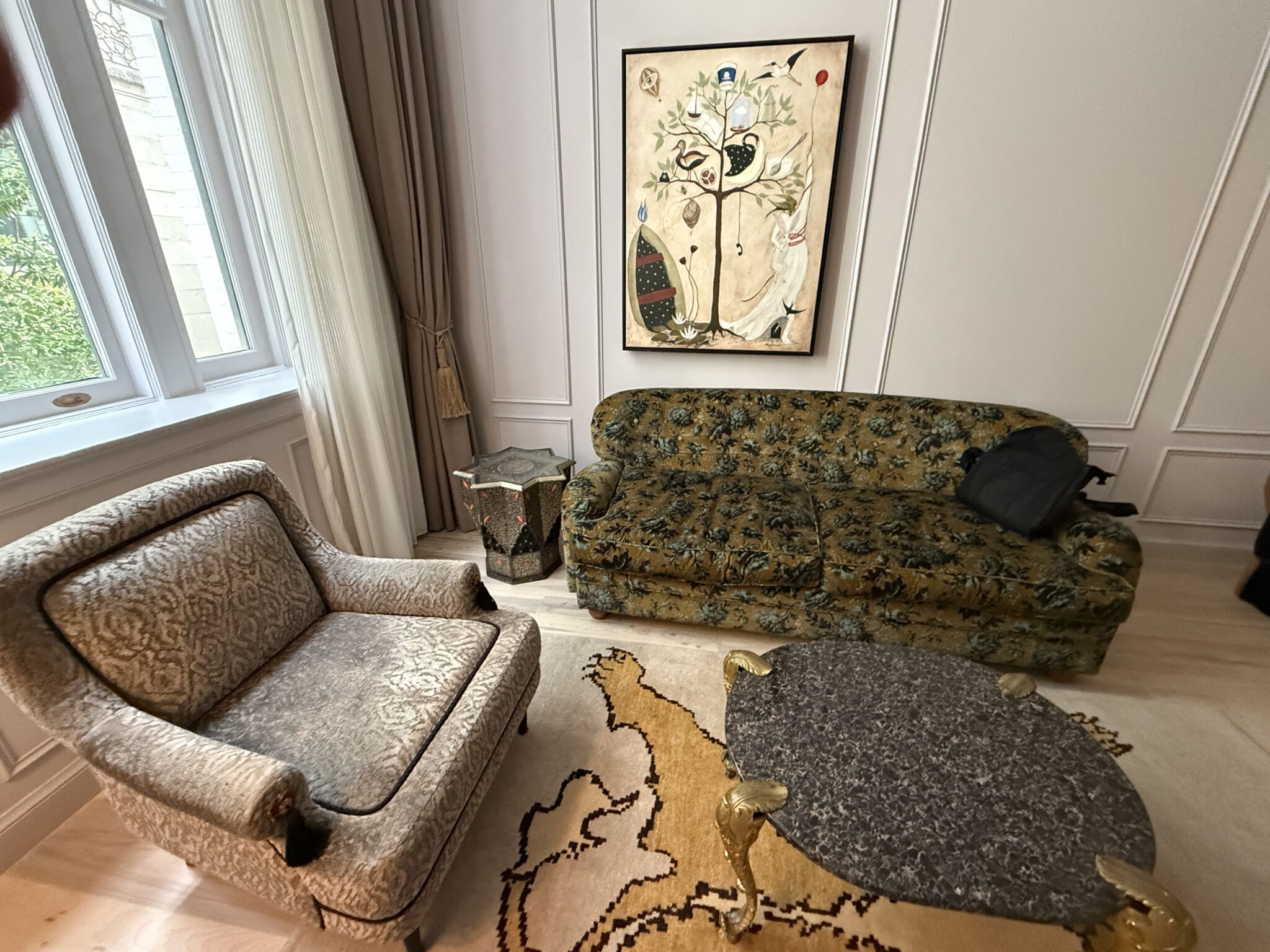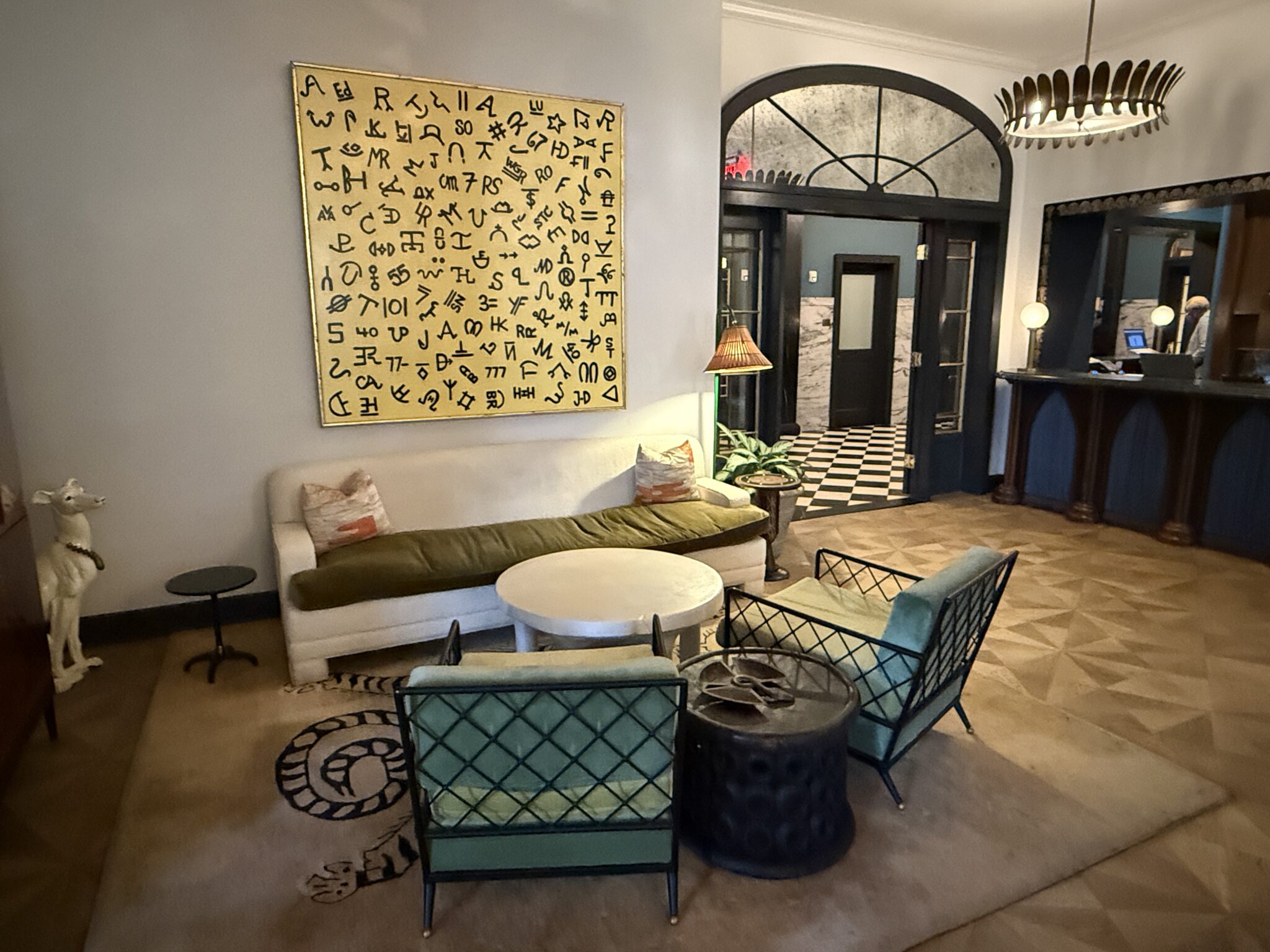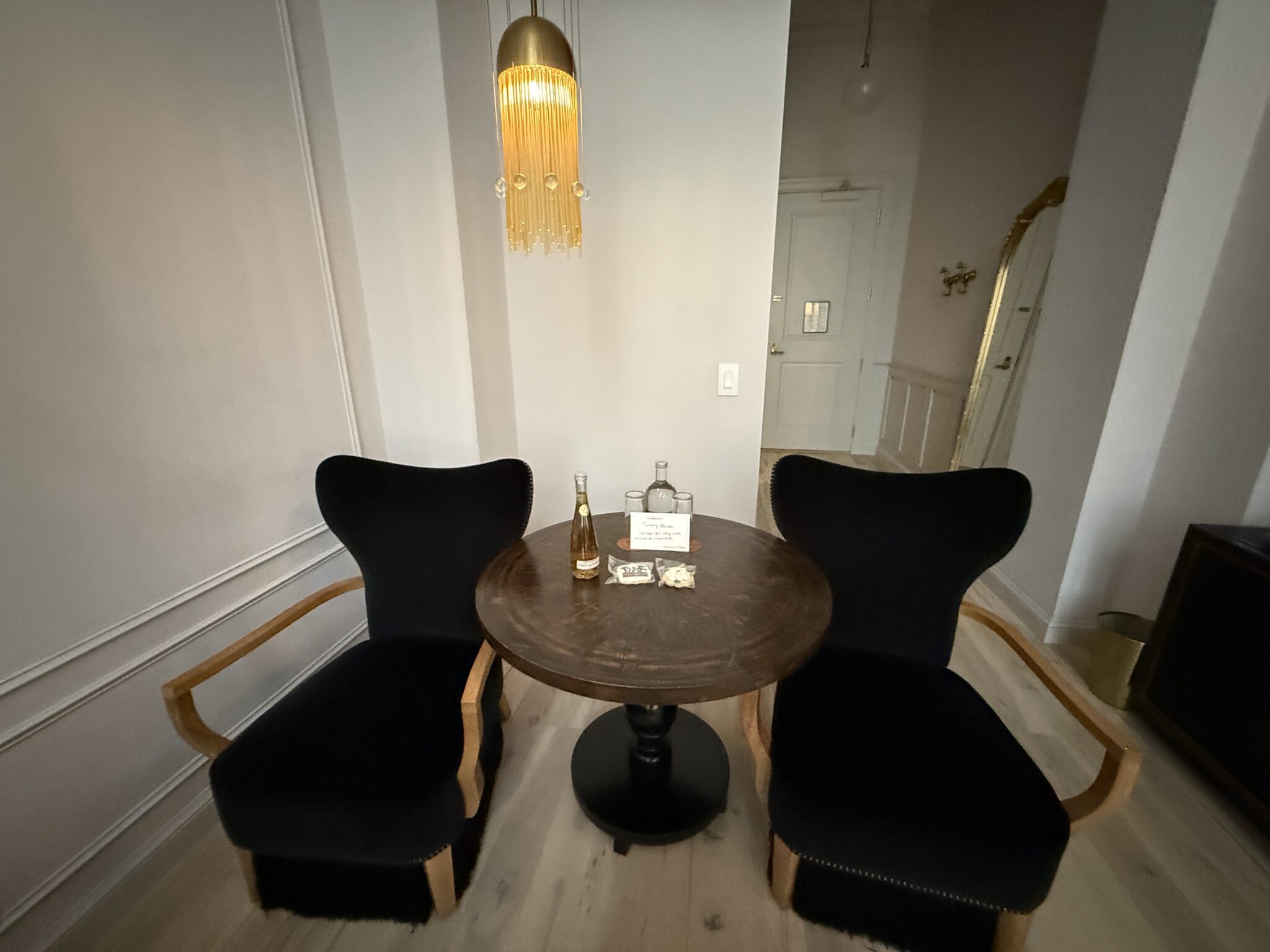 • Living Room: Lovely space with several seating areas oriented around a counter-lined column. This serves as the primary public space, changing functions throughout the day. In the morning, there’s coffee and tea (and this is where they lay out the breakfast buffet), in the afternoon, it changes to iced tea, lemonade, and small snacks. From 6 pm to 8 pm, complimentary wine and charcuterie are served, alongside an honor bar in the evening that stays open late and is stocked with complimentary cookies.