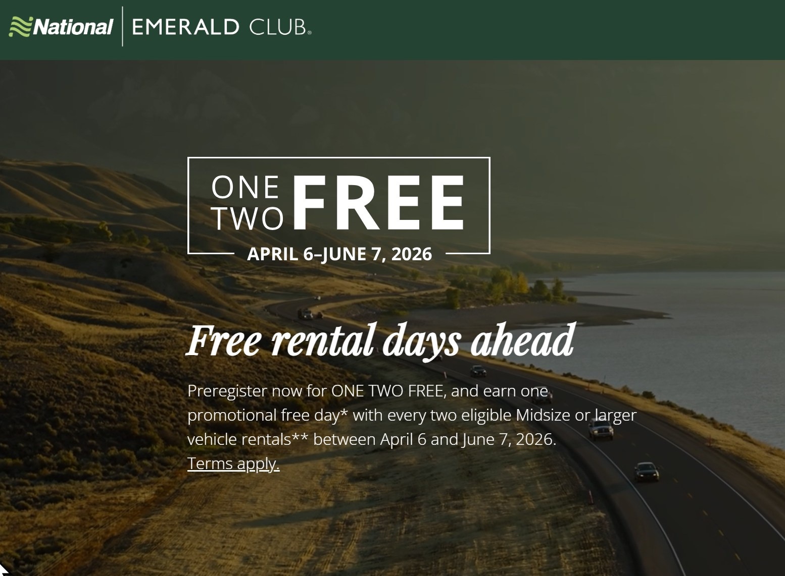- National Emerald Club has just launched registration for its next “One, Two, Free” promo which allows customers to earn a free rental day after two car rentals.
