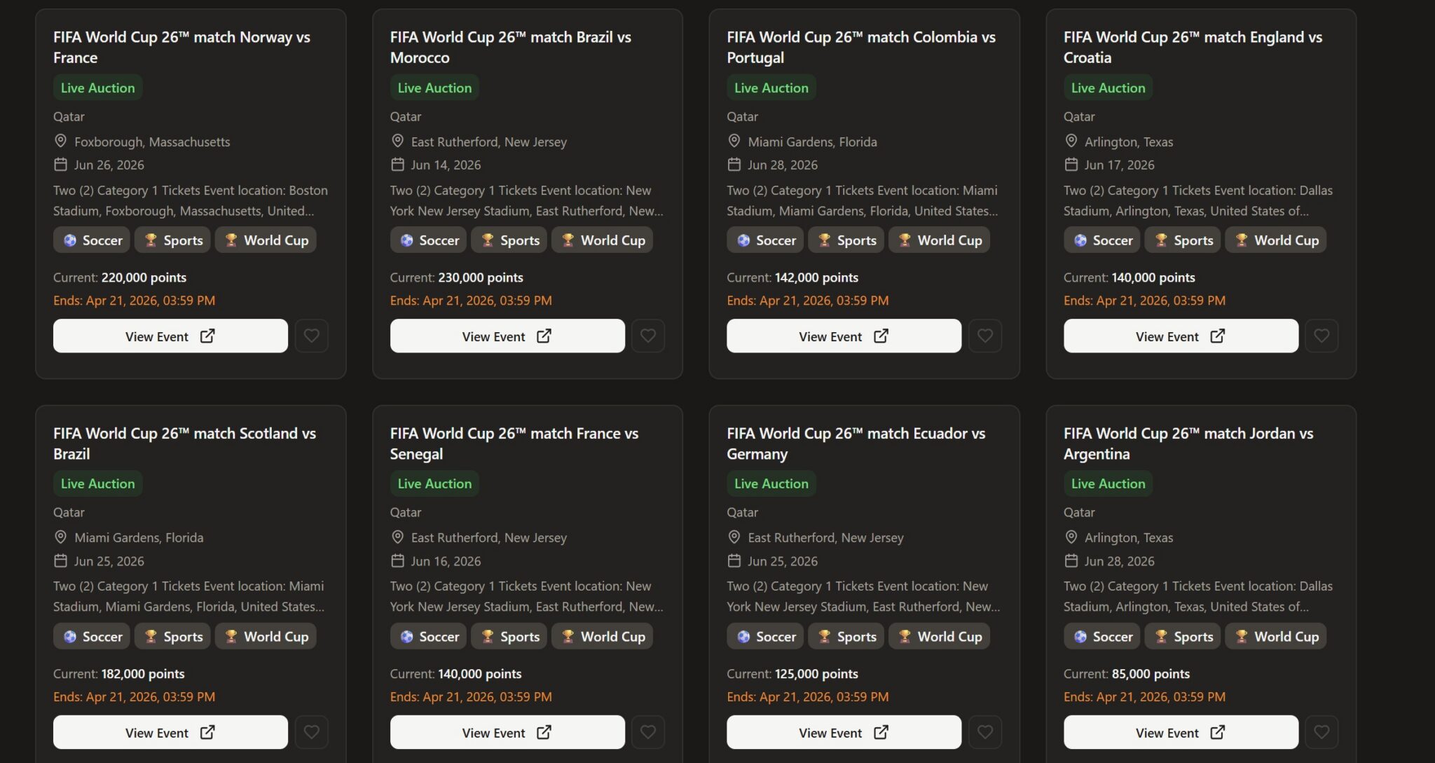 Thank you! Heads up for fans of the US team with a healthy balance of Avios — June 13 game between US & Paraguay is publicly available and, for now, it does not have any bids. Good luck