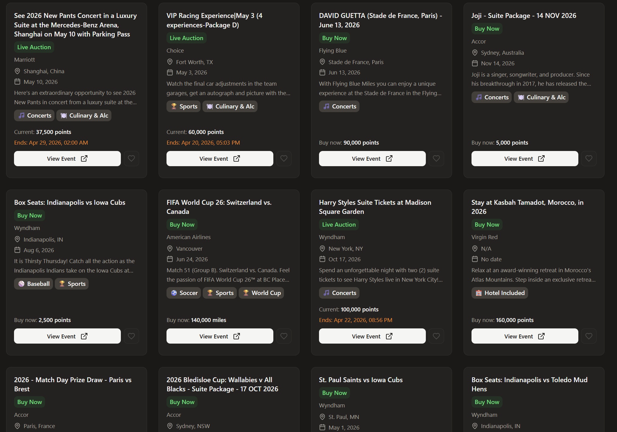 We received a tip from a reader/podcast listener about a website called Pointsevents.com. While not quite perfect, this is an incredibly cool tool that collates experiences bookable with points (such as through auctions or direct) through a whole bunch of programs. I’ve only briefly played with it, but I’ve already found some really cool-looking experiences that I hadn’t even realized were bookable with points.