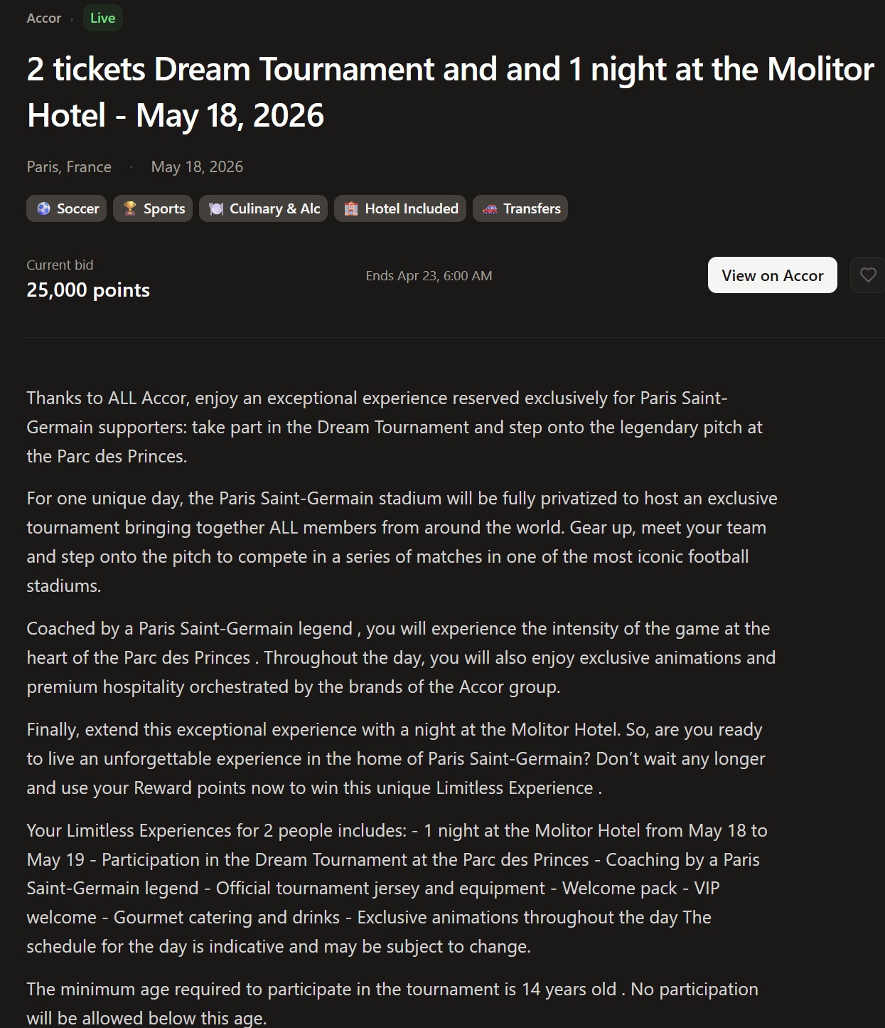 When you click on a particular event, the next page shows the event details/inclusions as well as a handy button to go directly to the auction page.
