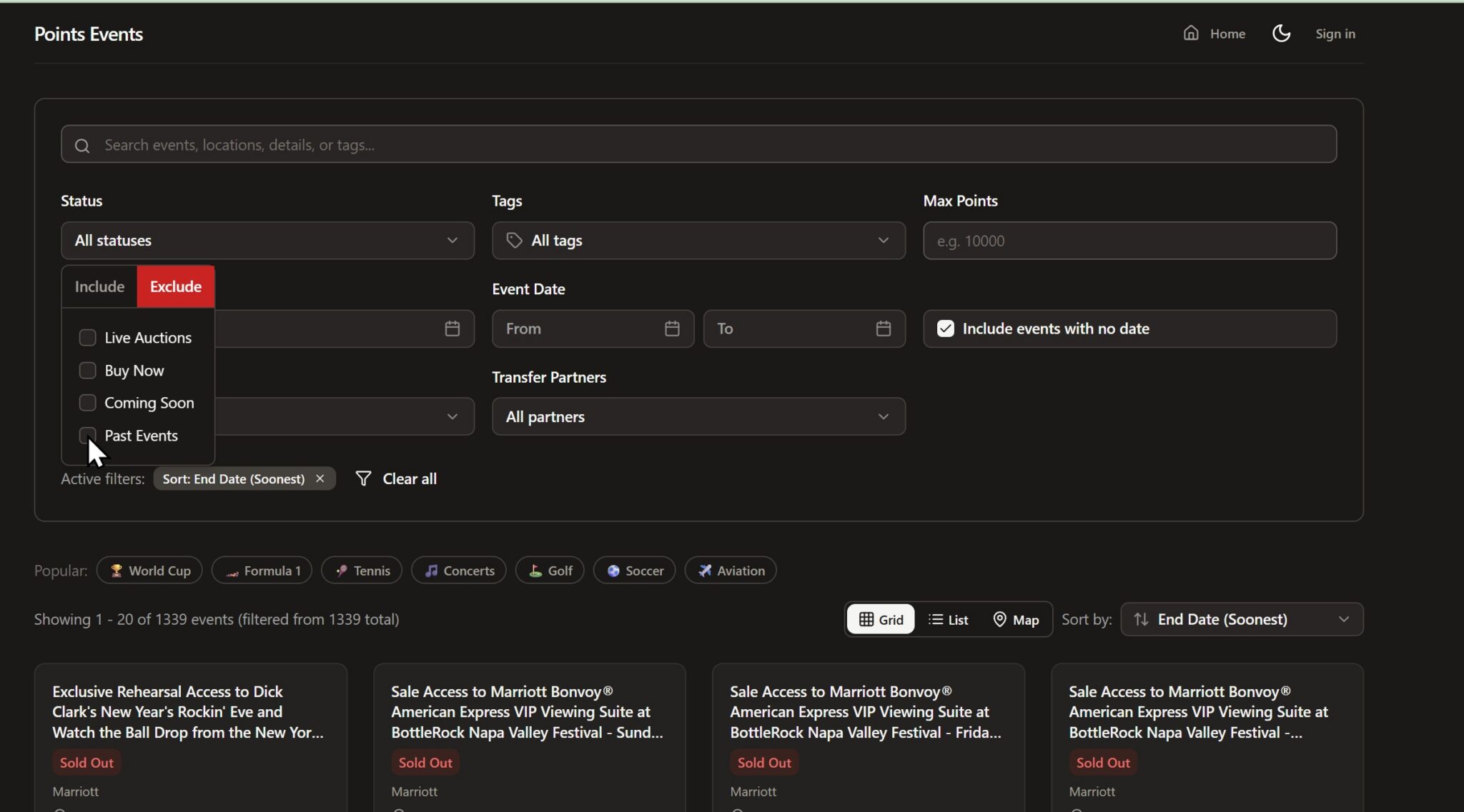 The Pointsevents website features a really simple interface that collates auction information into a single, sortable and filterable list. If, like me, you have a points spread across different programs and you want to see everything available, scroll past the map tool and find the button that says “Browse all events”.