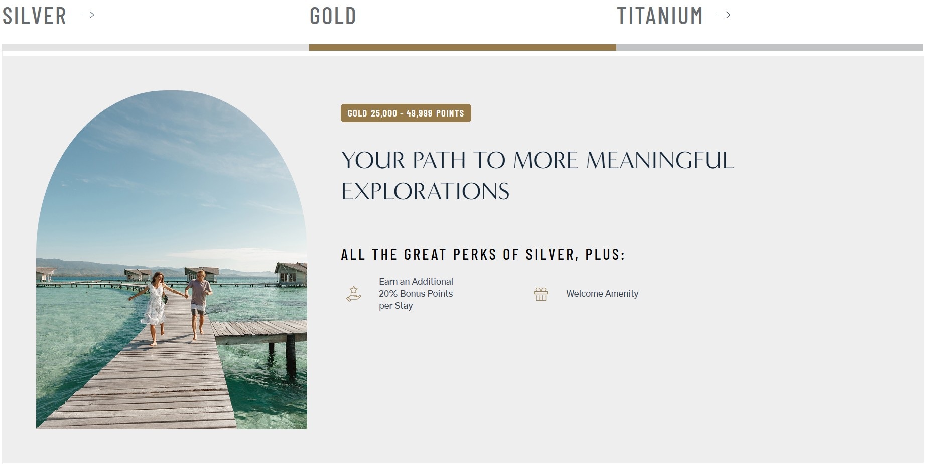 Gold status requires earning 25,000 tier-qualifying points within 12 months. Gold status only adds two benefits above Silver status: a 20% bonus on paid stays and a welcome amenity.