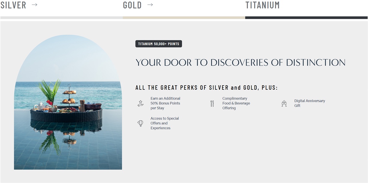 Titanium status requires earning 50,000 tier-qualifying points within 12 months. Titanium status adds the following benefits: