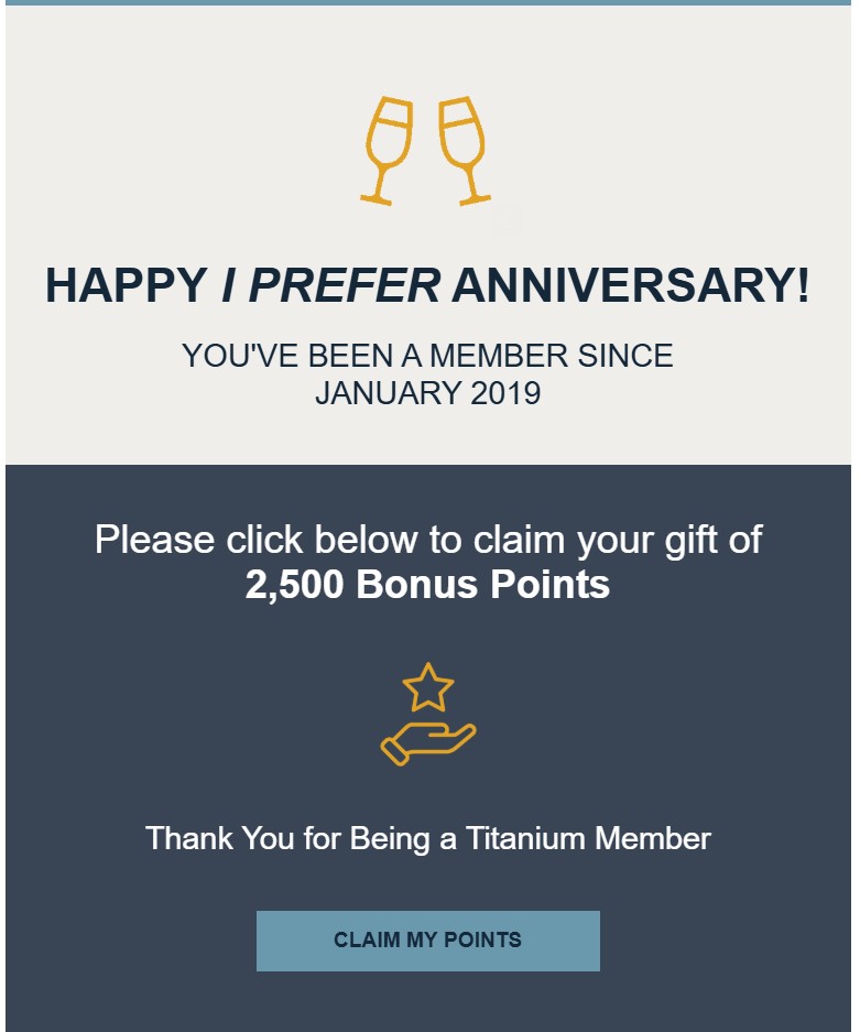 One of the I prefer Titanium benefits is a “digital anniversary gift.” I was about to write that I never received any such thing, but I would have been wrong! I searched my email for those exact words (“digital anniversary gift”), and voila! I found an email dated January 1, 2025, offering me 2,500 Bonus Points! I clicked “claim my points” and got a message saying “Congratulations on your anniversary with I Prefer Hotel Rewards! We have received your request for your anniversary gift (points) and will process it within the next 7-10 business days.”
