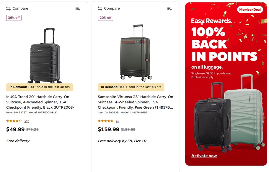 Valid on purchases of luggage made in Staples® U.S. stores or online at staples.com. Not valid on Instacart, DoorDash or Uber Eats orders. Limit of $250 spend on luggage. While supplies last. Offer available to Staples Easy Rewards™ member only. To be eligible for the offer, member must activate offer in their Easy Rewards dashboard on staples.com or Staples mobile app and provide membership number at checkout. Points will be earned on the purchase amount paid at checkout after application of all promotions, coupons, instant savings and point redemptions. Taxes and shipping are not included in calculating the total purchase amount. May be used up to once per week per Staples Easy Rewards member within the promotional period, nontransferable. Offer may not be combined with any other Staples Easy Rewards promotion in a single transaction. Not valid on prior purchases or purchases made with Staples Advantage In-Store Purchase Program. Offer is subject to change or cancellation at any time. Staples Easy Rewards program terms and conditions apply. For full program details visit staples.com/easy. Expires 10/11/25.