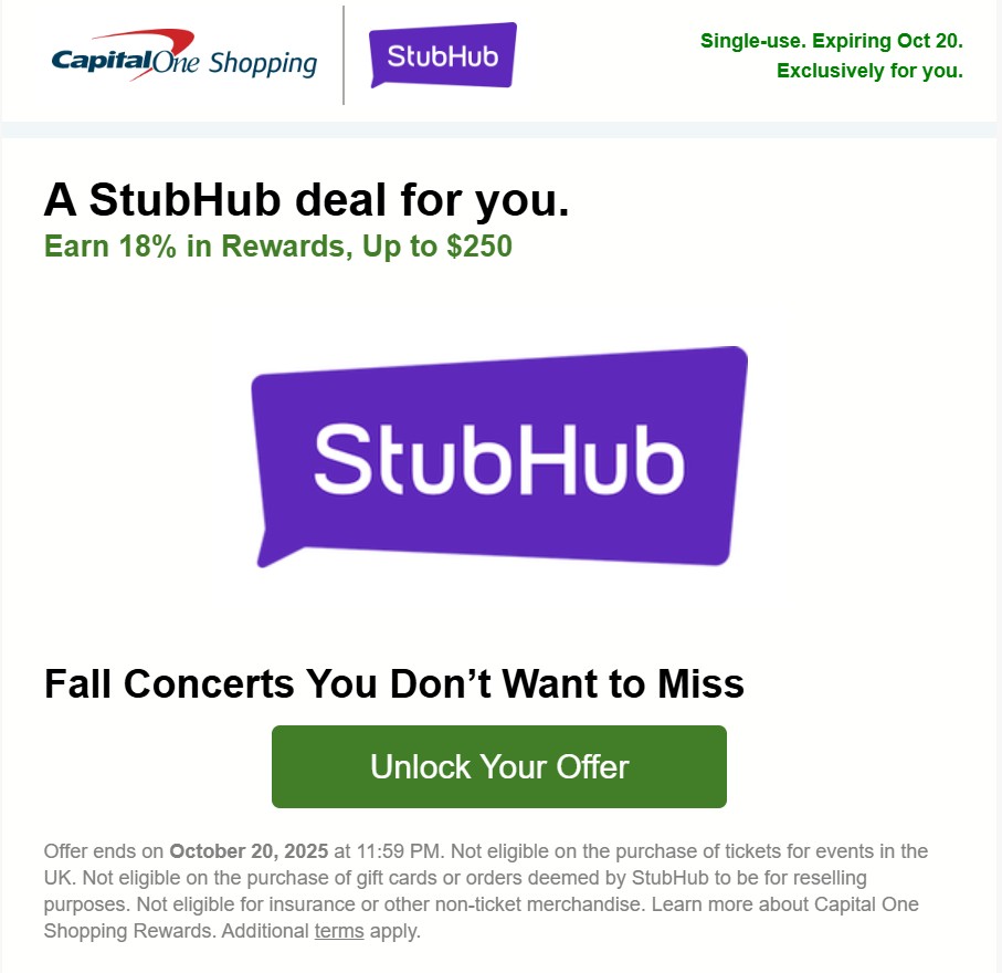 This one is a bit of a stretch, but bear with me as I explain… After searching StubHub for shows available during the dates I’d be in Chicago, I received a targeted offer from Capital One Shopping for 18% back at StubHub:
