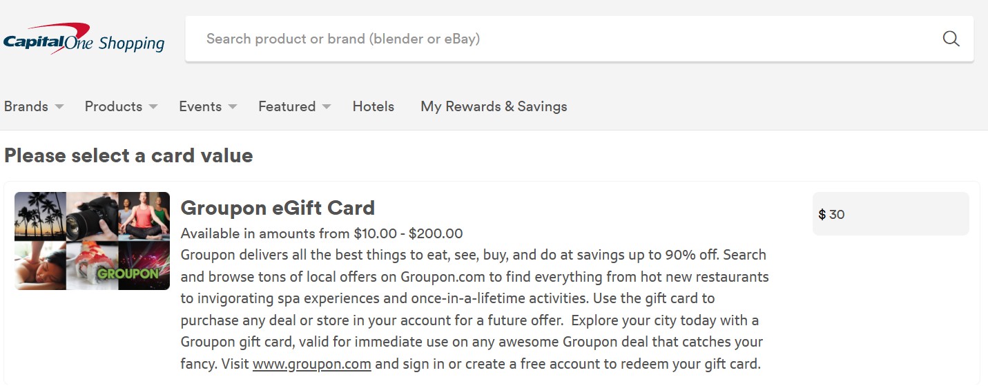 With the above deal, if I were to spend $170 or more on Stubhub, I would receive at least $30 back in Capital One Shopping rewards. I could then, in turn, redeem those rewards for a Groupon gift card: