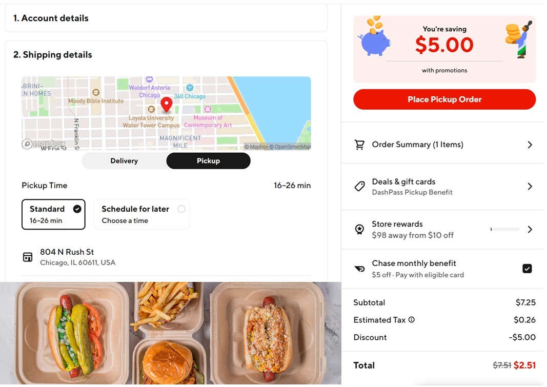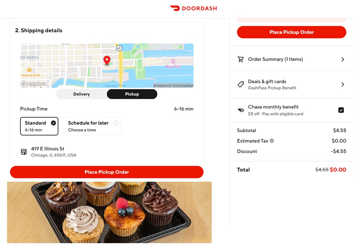Let’s use our $5 DoorDash discount to get a small snack for free or nearly free by selecting pick-up rather than delivery…