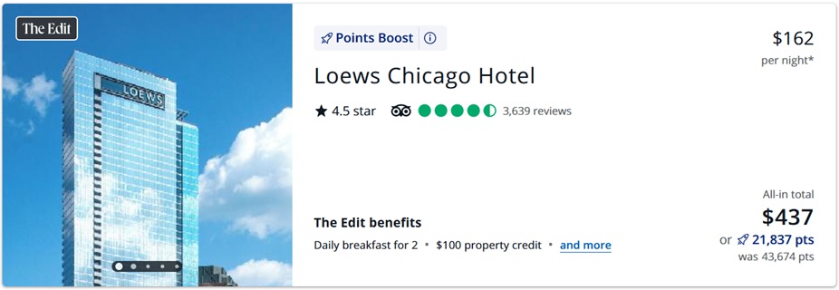 Chase’s $250 The Edit credit requires a two-night stay. The best deal I could find for a qualifying hotel in Chicago is the Loews Chicago Hotel, which costs $437 all-in from December 16th to 18th.