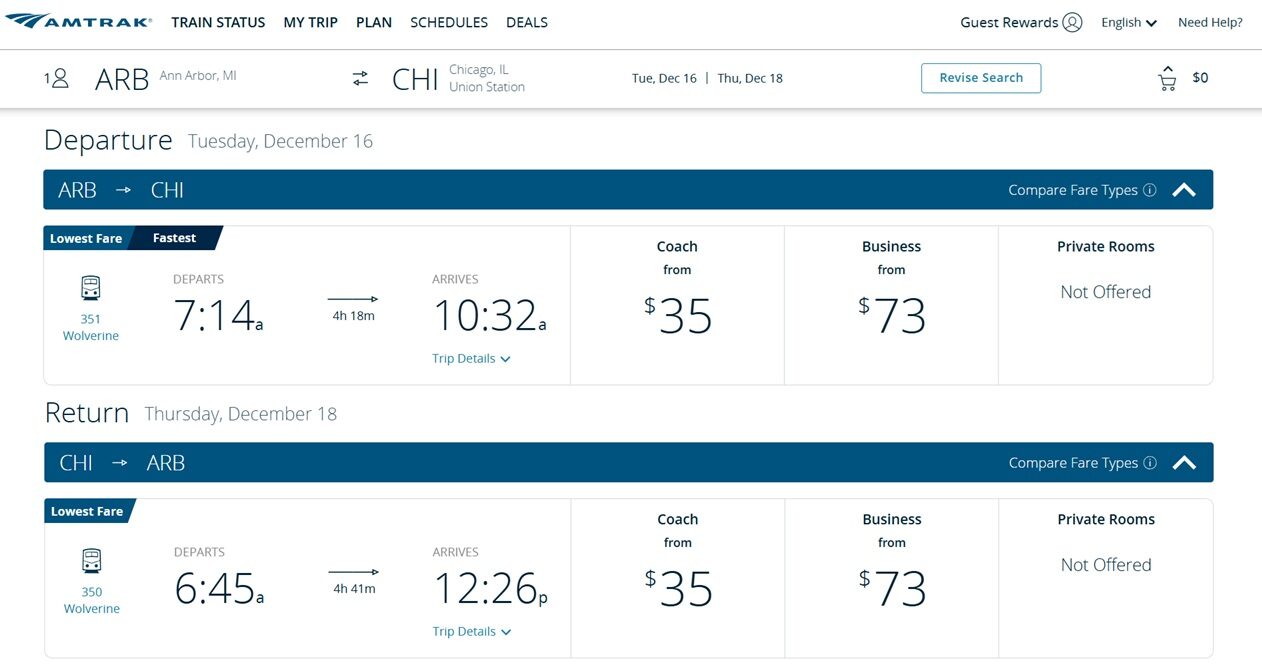 I happen to live very close to the Ann Arbor Amtrak station, so Amtrak is an excellent choice for me to get to Chicago. On the dates I’m looking at, I could travel round-trip for as low as $70 per person, or $140 total.