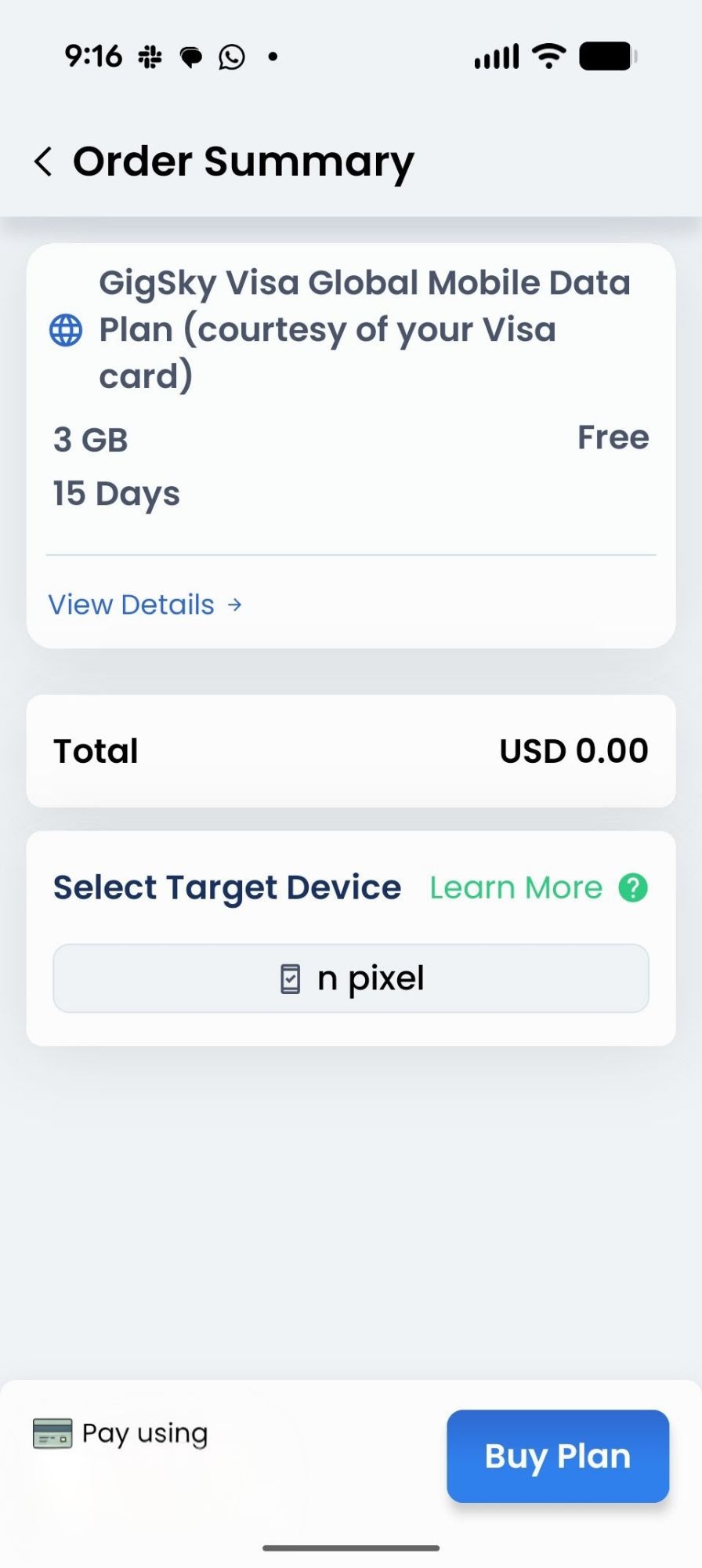 After several attempts to figure that out, I remembered that Visa Infinite cards qualify for a complimentary 15-day GigSky eSIM with 3GB of free high-speed data (I had forgotten that Visa Signature cards qualify for a free 15-day eSIM with 1GB of data, too — full details in this post). I had totally forgotten about this benefit, but I happened to see someone mention it on social media a few days prior, and it sprang back into my mind.