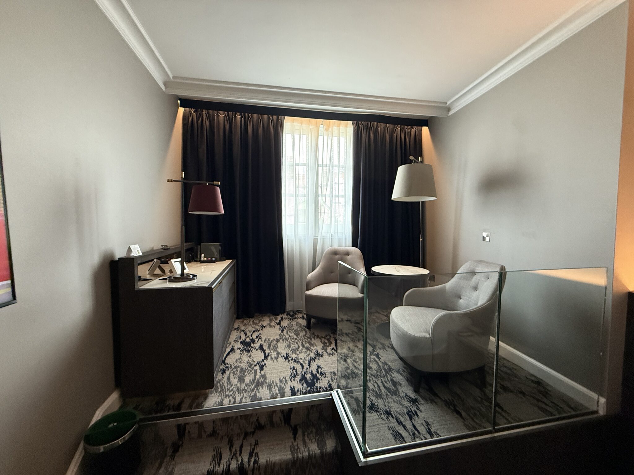 - Room: We booked a standard king guest room and were upgraded pre-arrival to a 320 square foot St. James King Room. These rooms are ~20% bigger than a standard room, and have an elevated “living room” area with a 2-person sitting area, bay windows, and a desk. The furnishings were well-maintained and very comfortable.