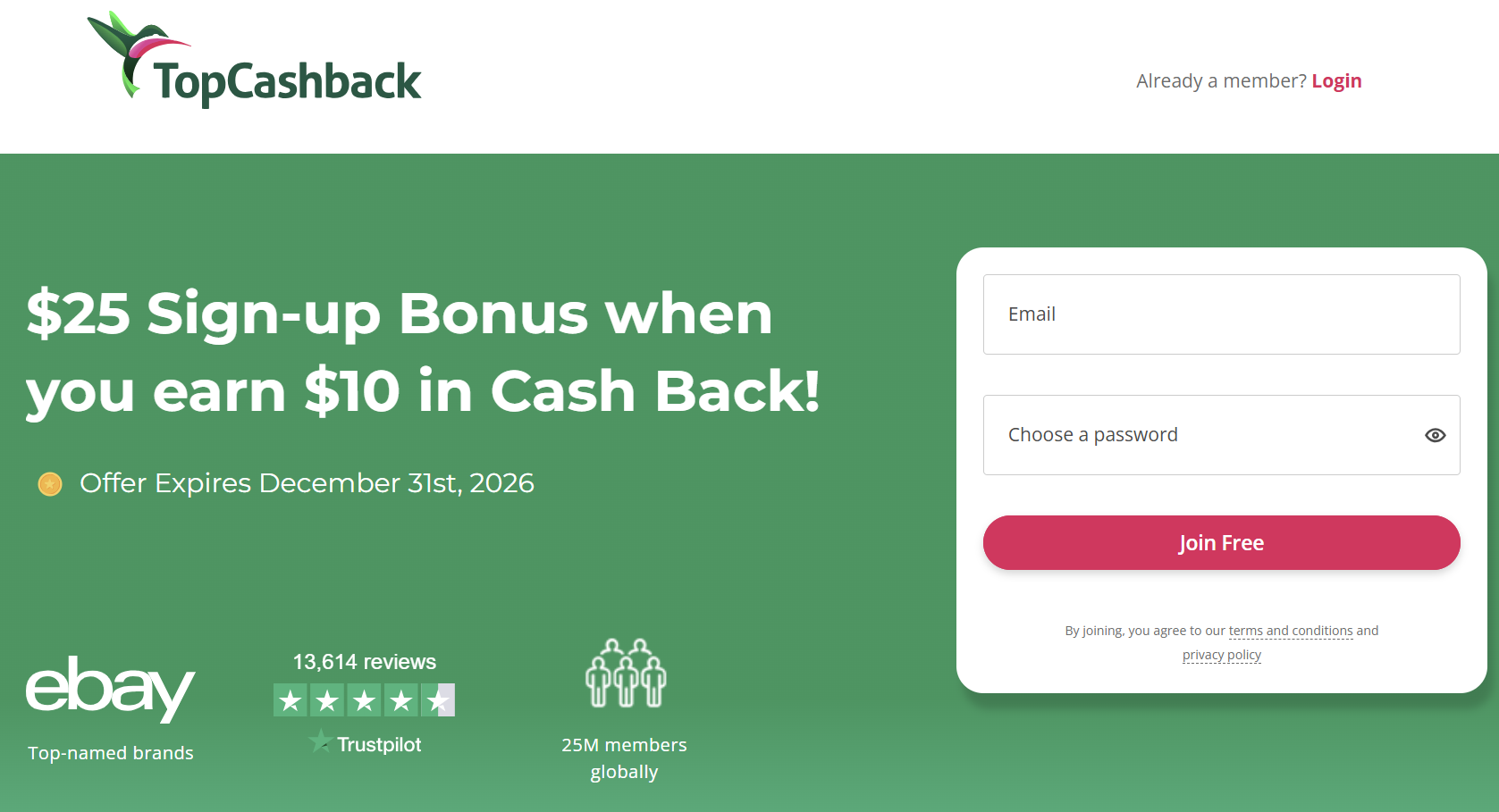 • Join TopCashback and get a $25 bonus when earning $10 cashback within the first 180 days.