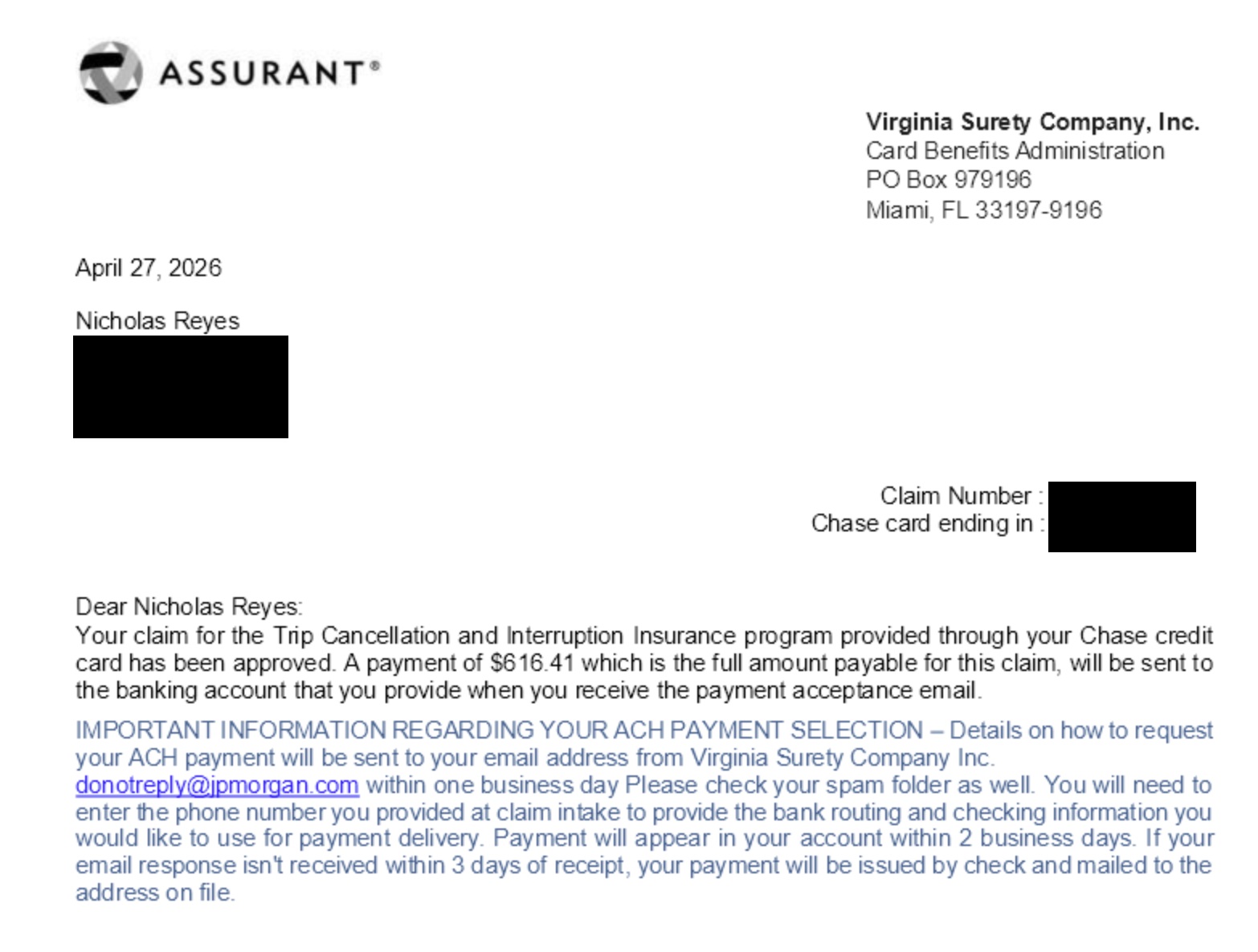 I received another email a day later from Virginia Surety Company Inc an Assurant company, that confirmed the payment amount and provided a link to enter my banking information to receive an ACH transfer for the payout.