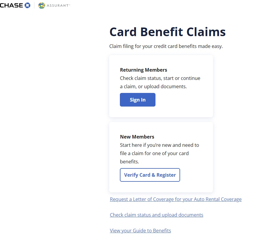 The process of filing the claim was very simple and straightforward. After consulting with benefits in my online account, I went to https://www.chasecardbenefits.com/file-claim to start the process of filing a claim. If you already have an account with the card benefits administrator, you can sign in. Otherwise, you have to verify your card and register for an account (this is separate from your Chase login, as the benefit administrator is a separate company).