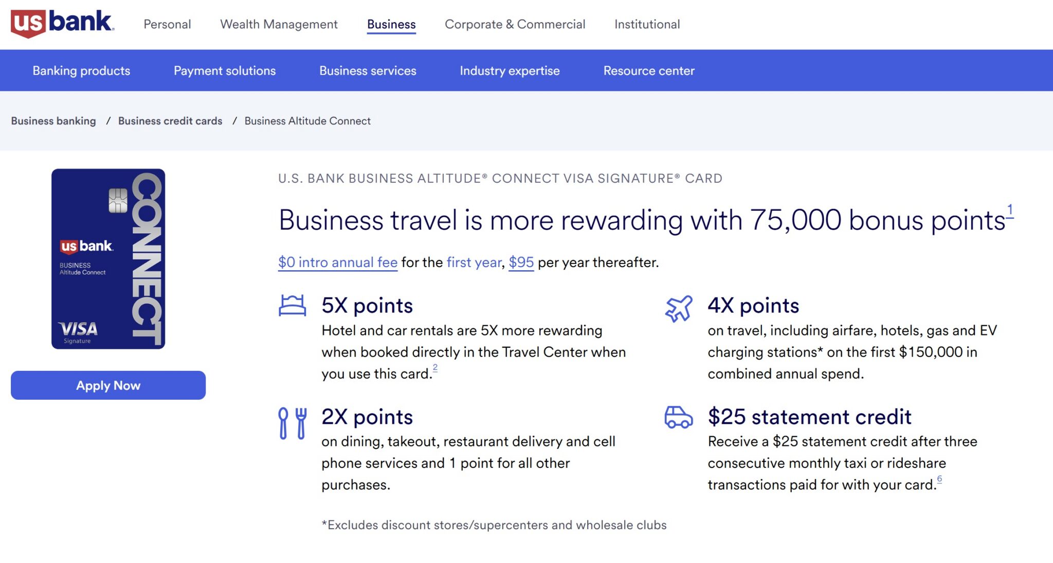 The US Bank Business Altitude Connect card’s welcome bonus has recently increased and is now 75,000 points (worth $750 when redeemed for a deposit to a US Bank checking account).