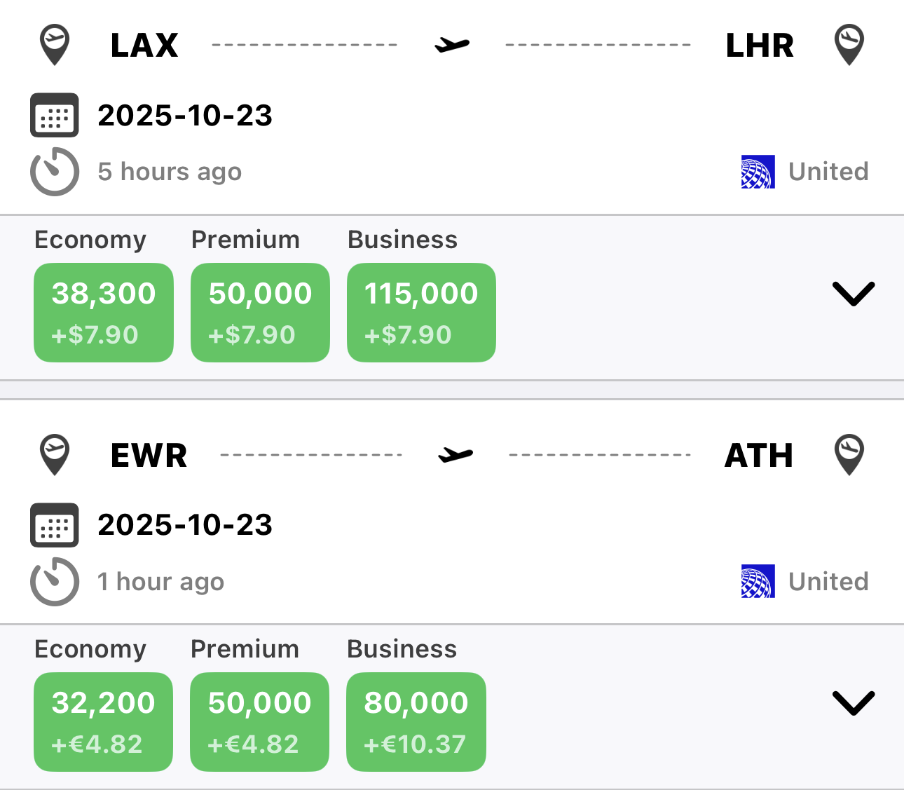 - Business from Newark (EWR) to Athens (ATH) – 80,000 miles each way