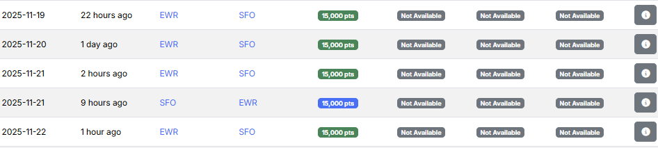 I rarely book flights using United, but I just happened to be looking at this flight a couple of days ago, and prices for November were starting at 15k…an increase of 33%. The same flight is still 15k via Air Canada, albeit with less availability: