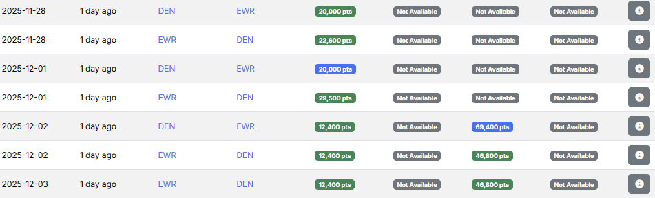 Gary mentions close-in flights from Denver to/from Newark increasing from 15k one-way to 20k. I’m seeing a bit more fudginess, but the starting price for flights within the next two weeks does indeed seem to be 20k: