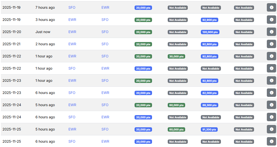 The same thing can be seen between Newark and San Francisco, where no seat within the next 14 days can be had for less than 20k: