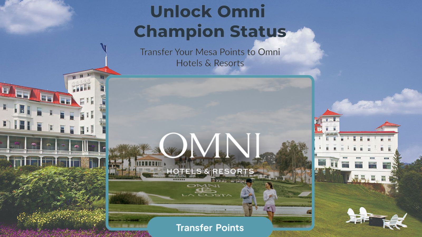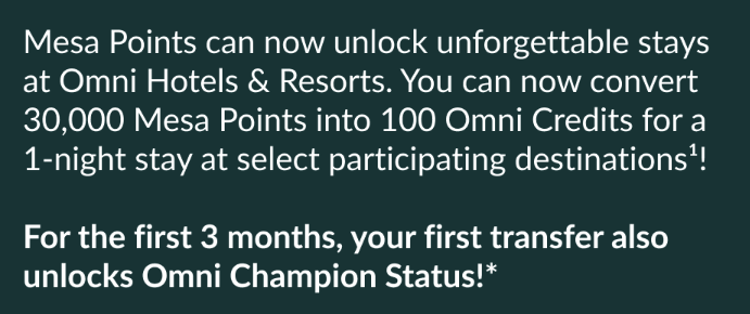 - Mesa members who transfer points to Omni Select Guest for a free night award within the first three months will receive Omni Champion elite status until 12/31/26.
