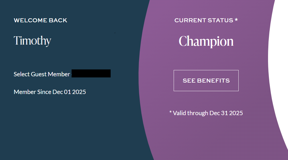 Curious about the Champion status, I transferred 30,000 points to Omni. A couple of hours later, I saw a free night award had been deposited into my Omni Select Guest account, and it now showed I had Champion status. There was only one problem: it expires 12/31/25, less than a month from now: