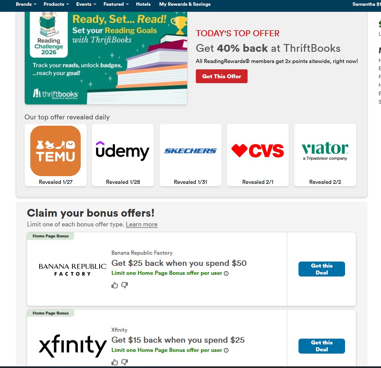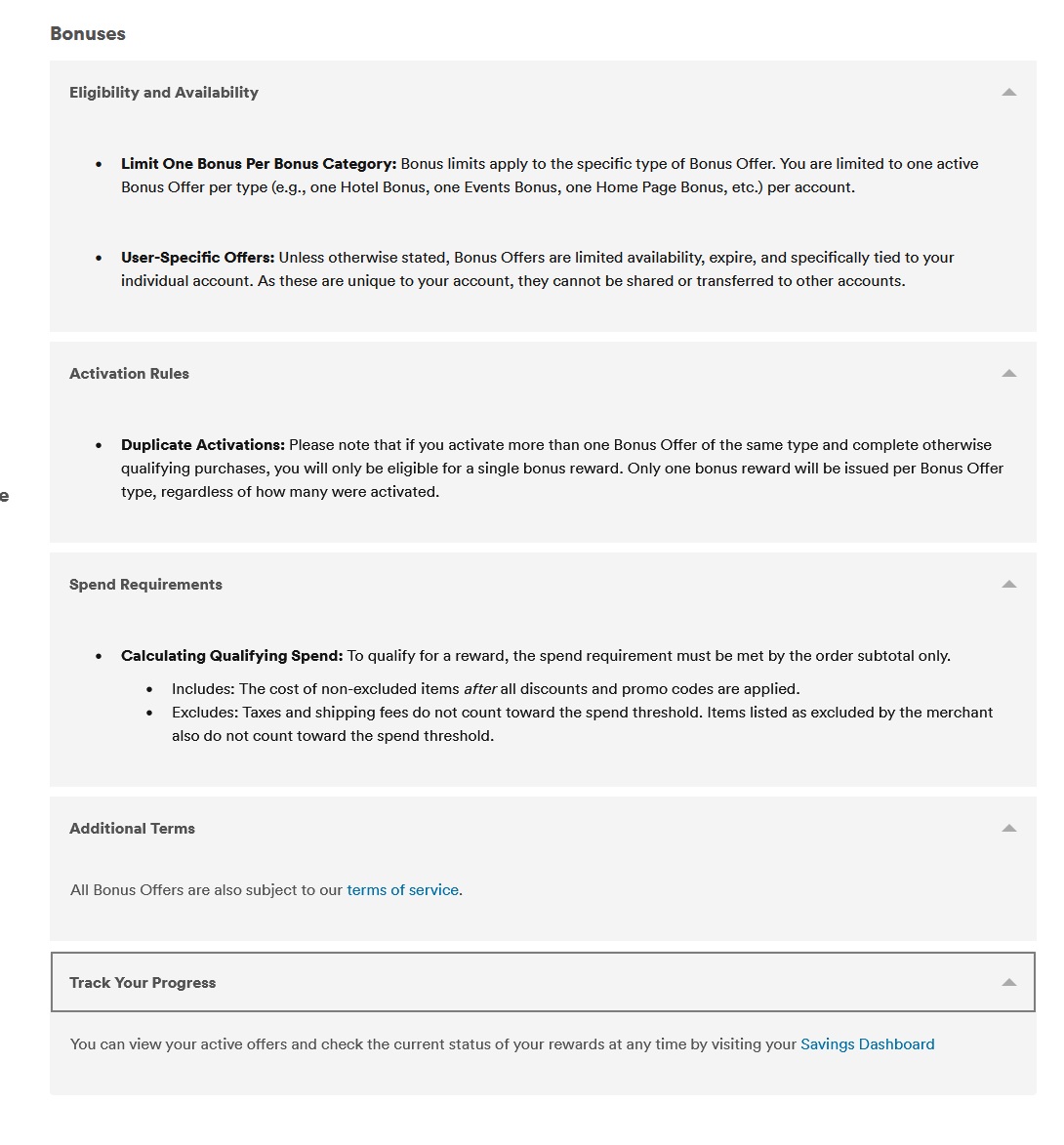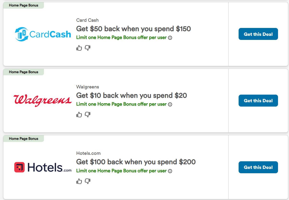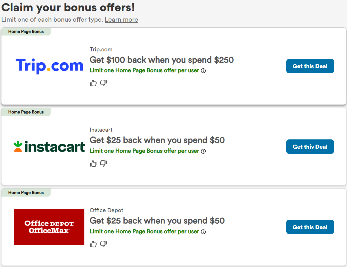 As you can see above, these “Home Page Bonus Offers” are on the Capital One Shopping home page between the daily deal near the top and the beginning of other targeted offers. They are displaying in a grey box in my wife’s account (with a link at the bottom to expand the box and show more of the home page bonus offers).