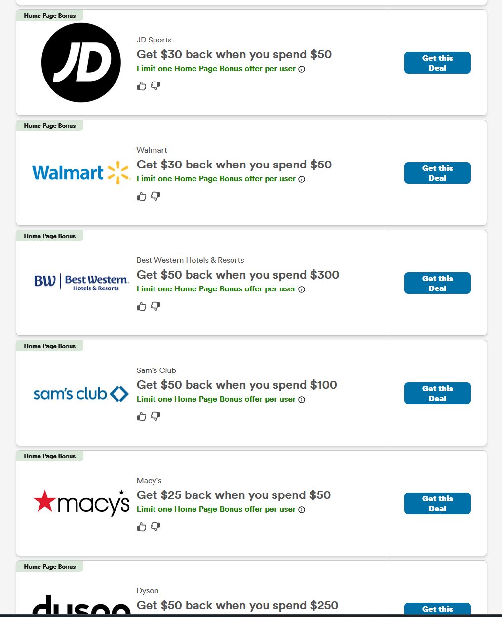 My wife is seeing mostly lukewarm offers, though $30 back on $50 at Walmart and $50 back on $100 at Sam’s Club are great deals.