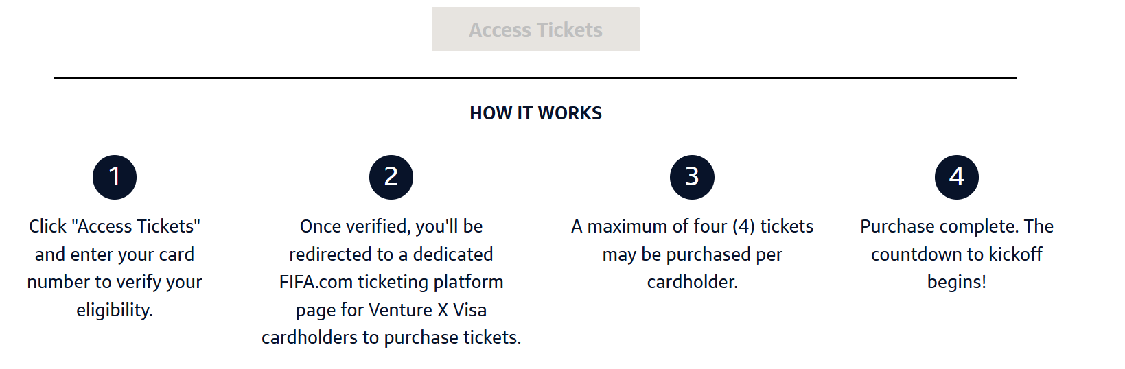- The Venture X Cardholder Offer on FIFA ticketing site opens on February 12, 2026, 12:00 p.m. ET and closes on February 24, 2026, 11:59 p.m. ET, or until available tickets are sold out, whichever comes first.